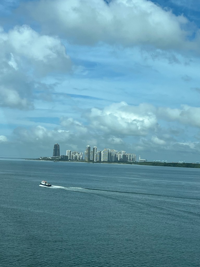 Sulla costa, sulla sinistra, una distesa di grattacieli moderni, avvolti da una leggera foschia. Una vista affascinante e inquietante allo stesso tempo.