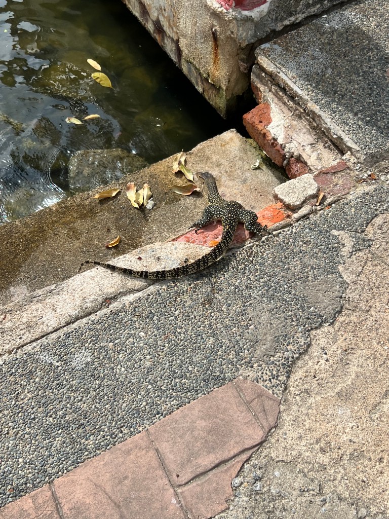 All’improvviso un signore del posto, sorridente, mi indica qualcosa: un varano d’acqua asiatico, immobile sulla sponda. Lo fotografo, poi lo riprendo in un video. Ma con un movimento fulmineo, si tuffa nel fiume e scompare. Poco più avanti, un bambino taglia l’erba con delle forbici accanto a una tartaruga gigante. Tutto è così surreale, eppure perfettamente normale in questo angolo di mondo.