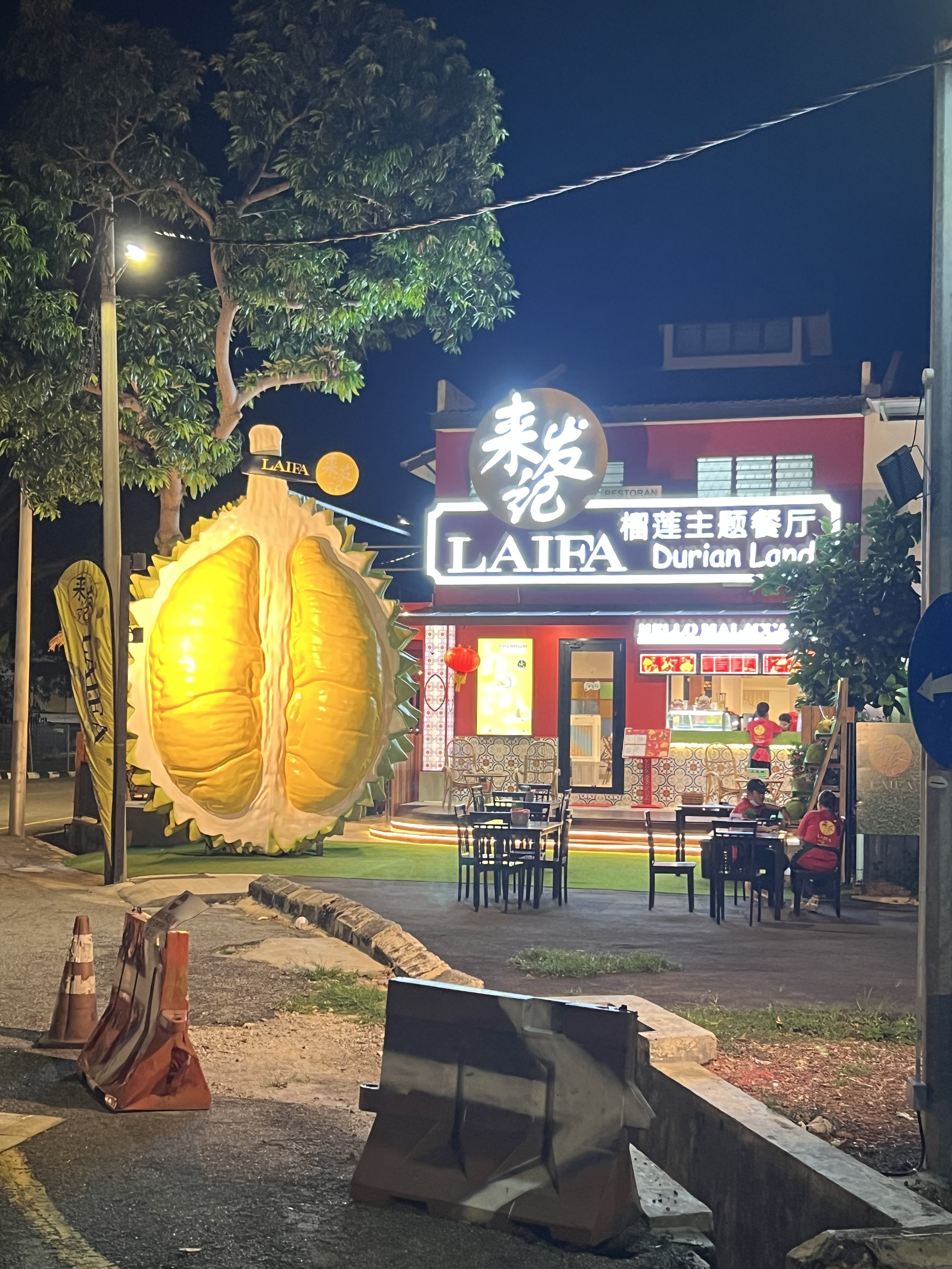 Finisco la bevanda ed esco dal supermercato, mi intrufolo in un vicolo e mi trovo in un parcheggio immenso. In lontananza, un durian gigante. È finto, ovvio, ma curioso. Mi avvicino: Durian Land, bar dedicato interamente al frutto più controverso del Sud-est asiatico famoso (o famigerato) per le sue dimensioni, la sua scorza spinosa e, soprattutto, il suo odore estremamente pungente e distintivo. Non l’ho mai assaggiato, quindi decido di assaggiare un caffè ghiacciato con durian frullato. Scelta coraggiosa: non lo digerirò per due giorni.
