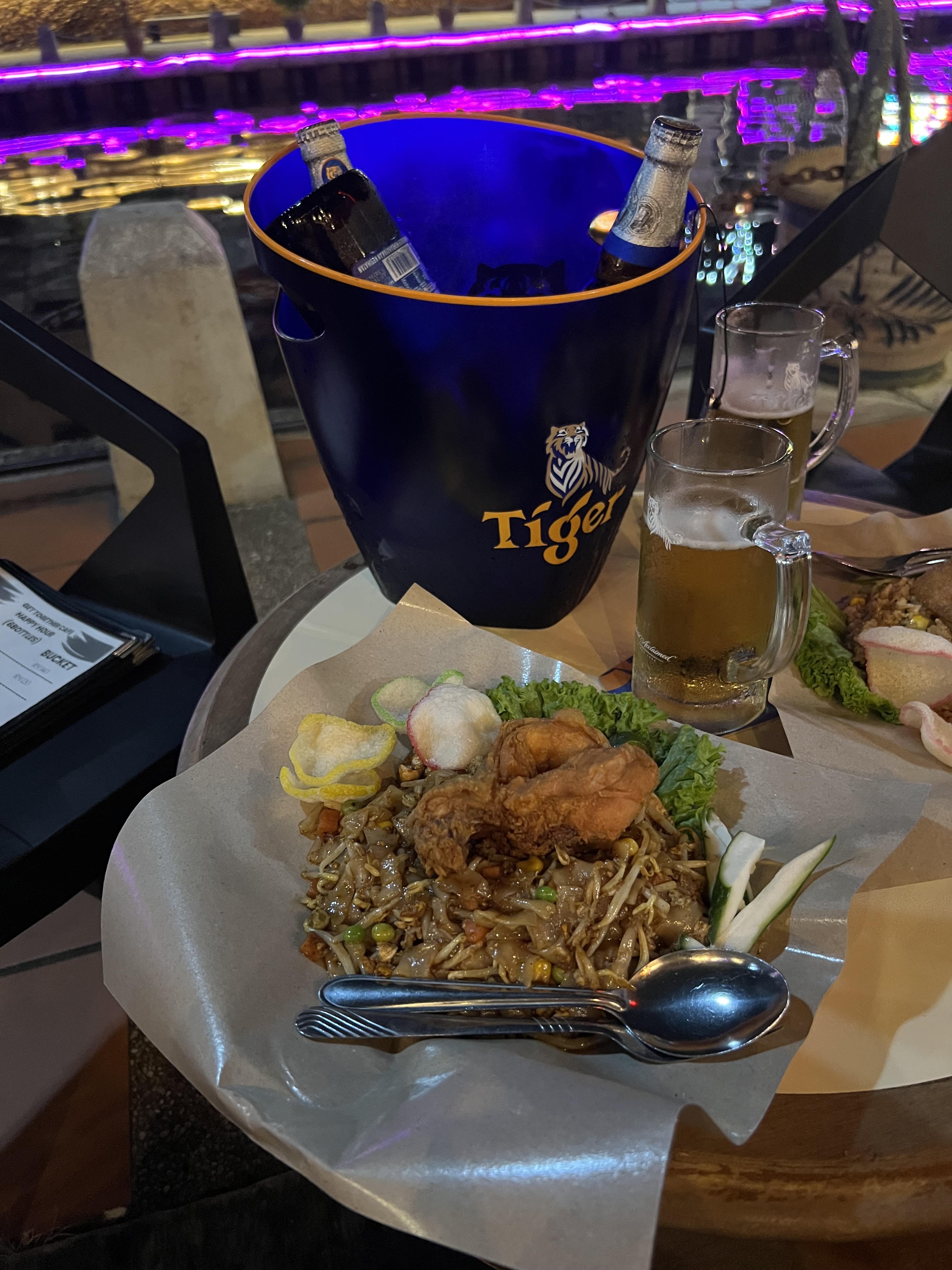 Scendiamo e decidiamo di cenare insieme sul lungofiume, al primo posto aperto. Ordino un piatto malese speziato e una birra gelata. La cena è semplice, ma bella, perché condivisa. Il locale inizia a chiudere, sistemano tavolini e sedie. Restiamo ancora qualche minuto, a osservare il fiume e il riflesso delle luci nelle sue acque scure.