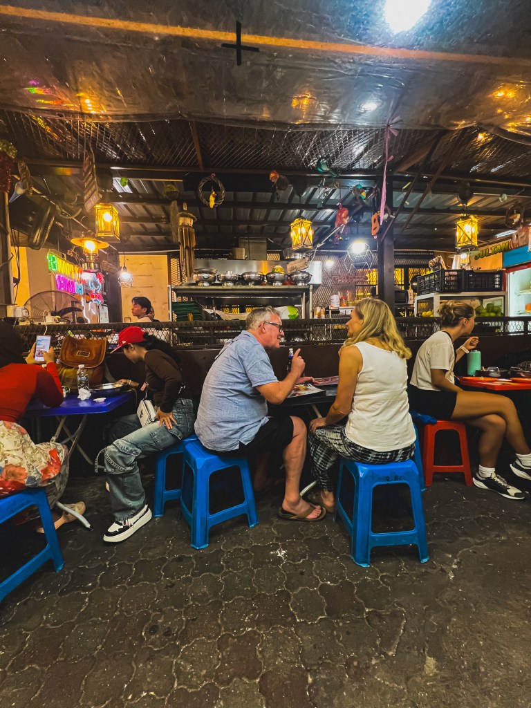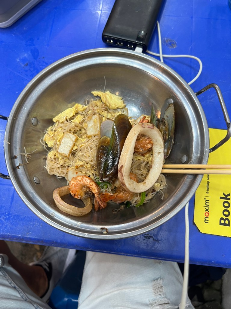 Uscendo dall’altra parte del mercato, mi imbatto in una strada piena di ristoranti e bancarelle di street food. I profumi mi riportano bruscamente alla realtà: non ho ancora pranzato. Scelgo un posticino che mi sembra autentico: sgabelli di plastica, tavolini bassi, e la maggior parte dei clienti sono locali. Ottimo segno. Qualche turista qua e là, ma niente di troppo affollato. Ordino un piatto di noodles saltati con uova, tofu, cozze, gamberi e calamari. Quel mix mi sembrava irresistibile.
