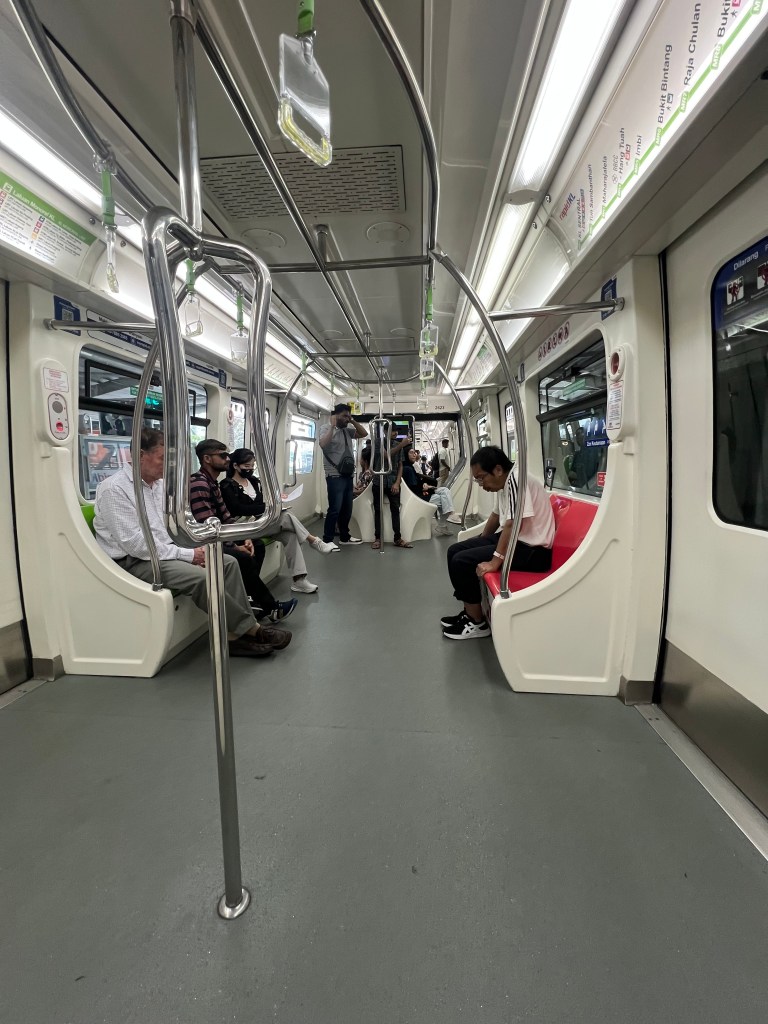 Attraverso la strada con attenzione, evitando gli scooter che sfrecciano, e mi fermo a mangiare qualcosa. Un piccolo banco ambulante proprio accanto a un McDonald vende spiedini di pollo speziato. Il profumo è irresistibile. Mi siedo su una panchina improvvisata, mentre sopra di me scorrono i binari sospesi della metro, come serpenti d’acciaio tra i palazzi. A Kuala Lumpur, molte linee della metropolitana sono sopraelevate, creando un’atmosfera da film futuristico.