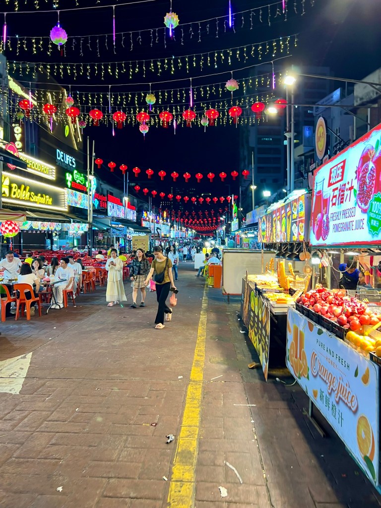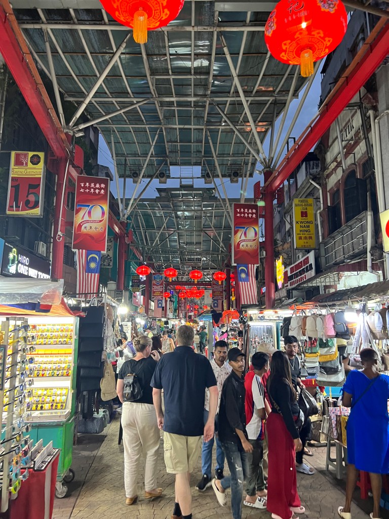 Finalmente arrivo a Jalan Petaling, una delle attrazioni turistiche più note della capitale. Situata nel cuore del quartiere cinese, questa via è un’esplosione di vita, colori e profumi. È diventata meta popolare per chi cerca autentici prodotti cinesi, street food e un’atmosfera unica. Conosciuto anche come Chinatown, il mercato è un fitto labirinto di bancarelle, negozi e ristoranti. Qui si può trovare di tutto: dai souvenir tradizionali ai vestiti contraffatti, dalle spezie ai gioielli, passando per prodotti elettronici e articoli per la casa.