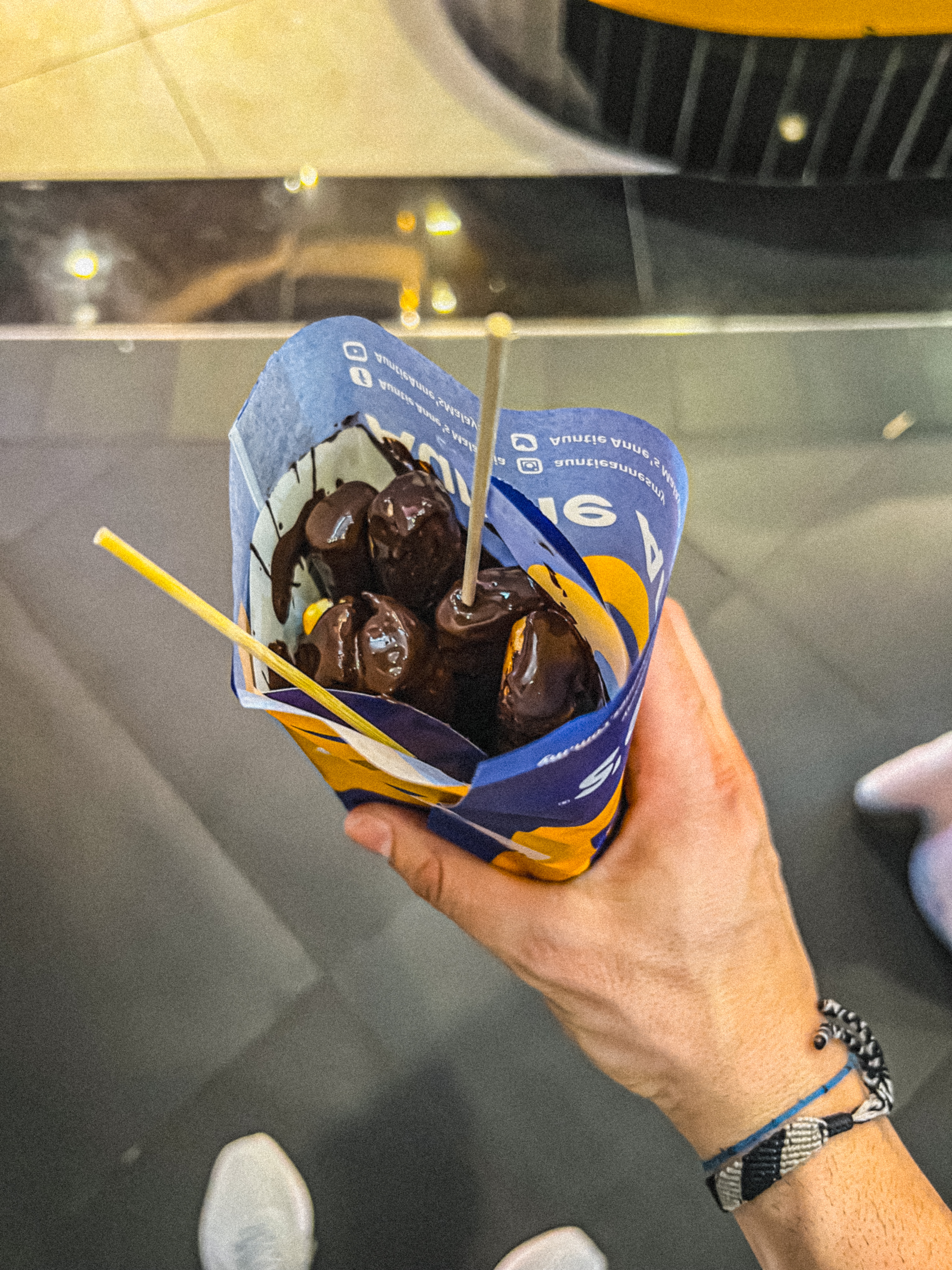 Guardo meglio: spiedini di palline fritte, croccanti fuori e morbide dentro, ricoperte da una colata di cioccolato fondente fuso. Sembra una follia. Ne prendo uno. È delizioso. Lo mangio con le mani, ridendo da solo. Kuala Lumpur sa anche essere dolce.
