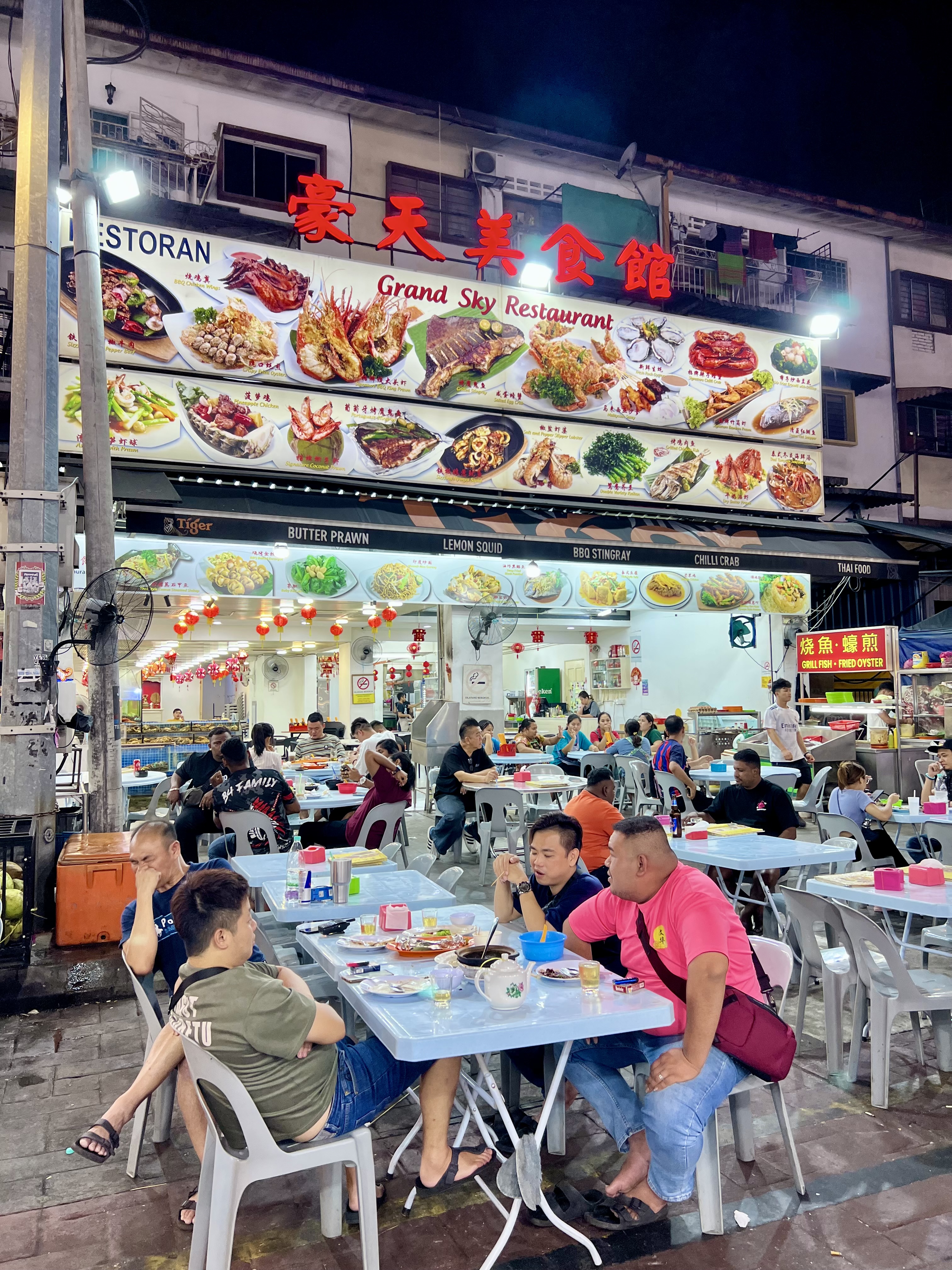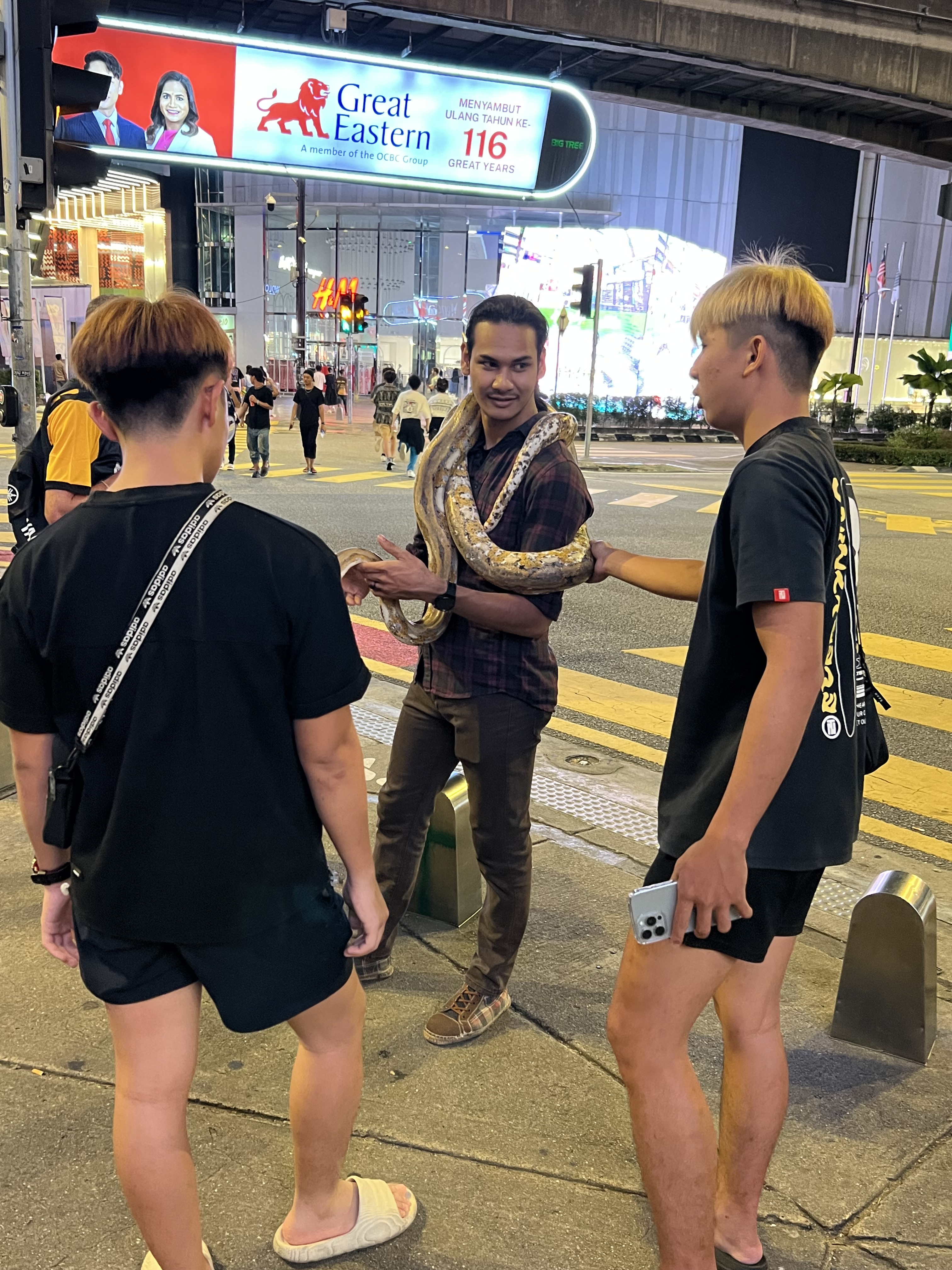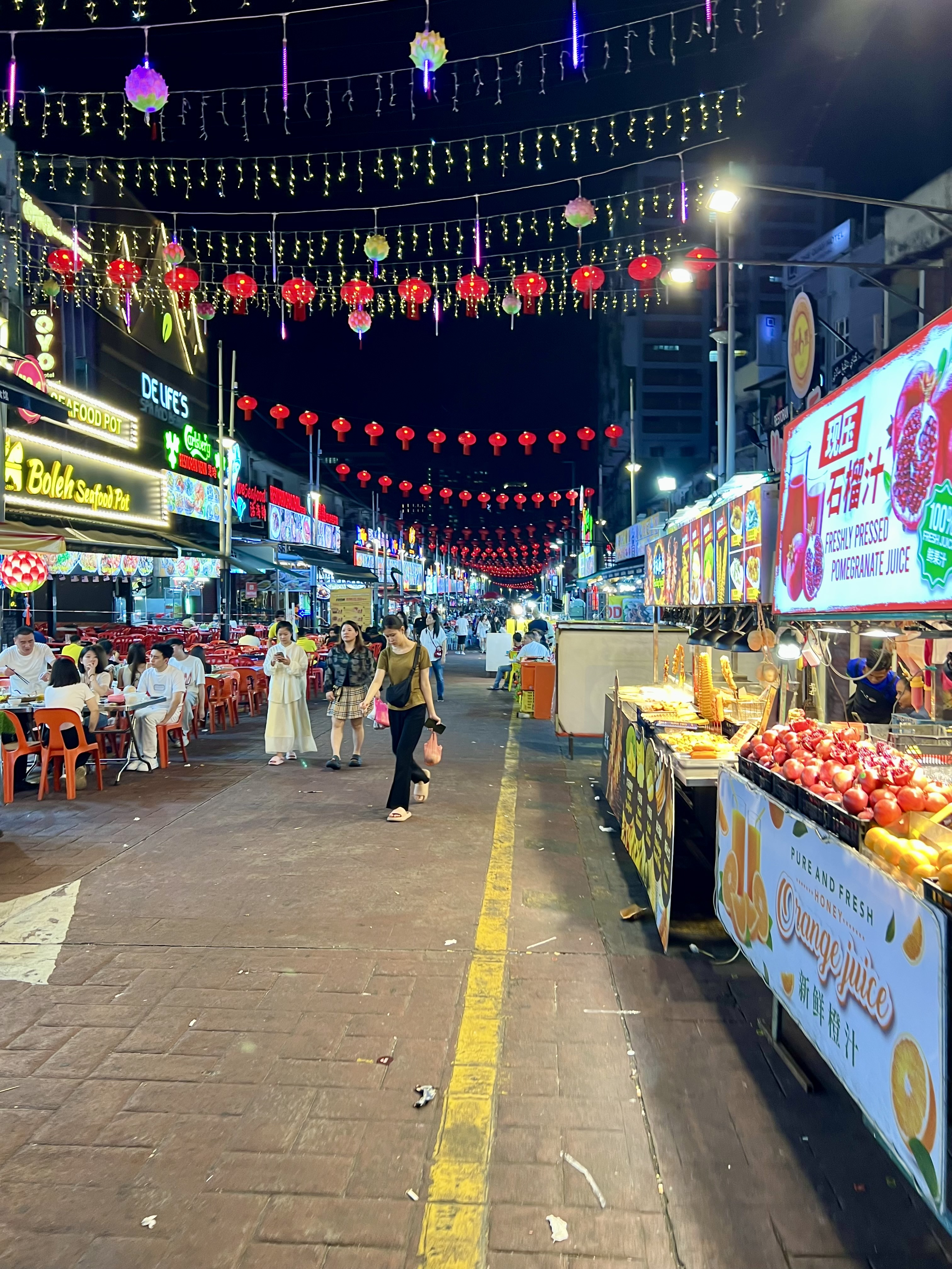 Attraverso la strada e vengo accolto da un ragazzo con un serpente gigante intorno al collo. Ottimo inizio. Più avanti, tra karaoke, ristoranti e mini-market, in un incrocio un gruppo suona musica dal vivo. C’è tanta gente. Mi fermo cinque minuti ad ascoltarli, poi proseguo verso Jalan Alor, una delle strade più iconiche di Kuala Lumpur. È un tripudio di luci, odori e sapori. Tanti ristoranti, bancarelle, cibo malese, cinese e thailandese. Cammino, mangio qualcosa al volo, e mi ritrovo in una strada piena di bar e locali.