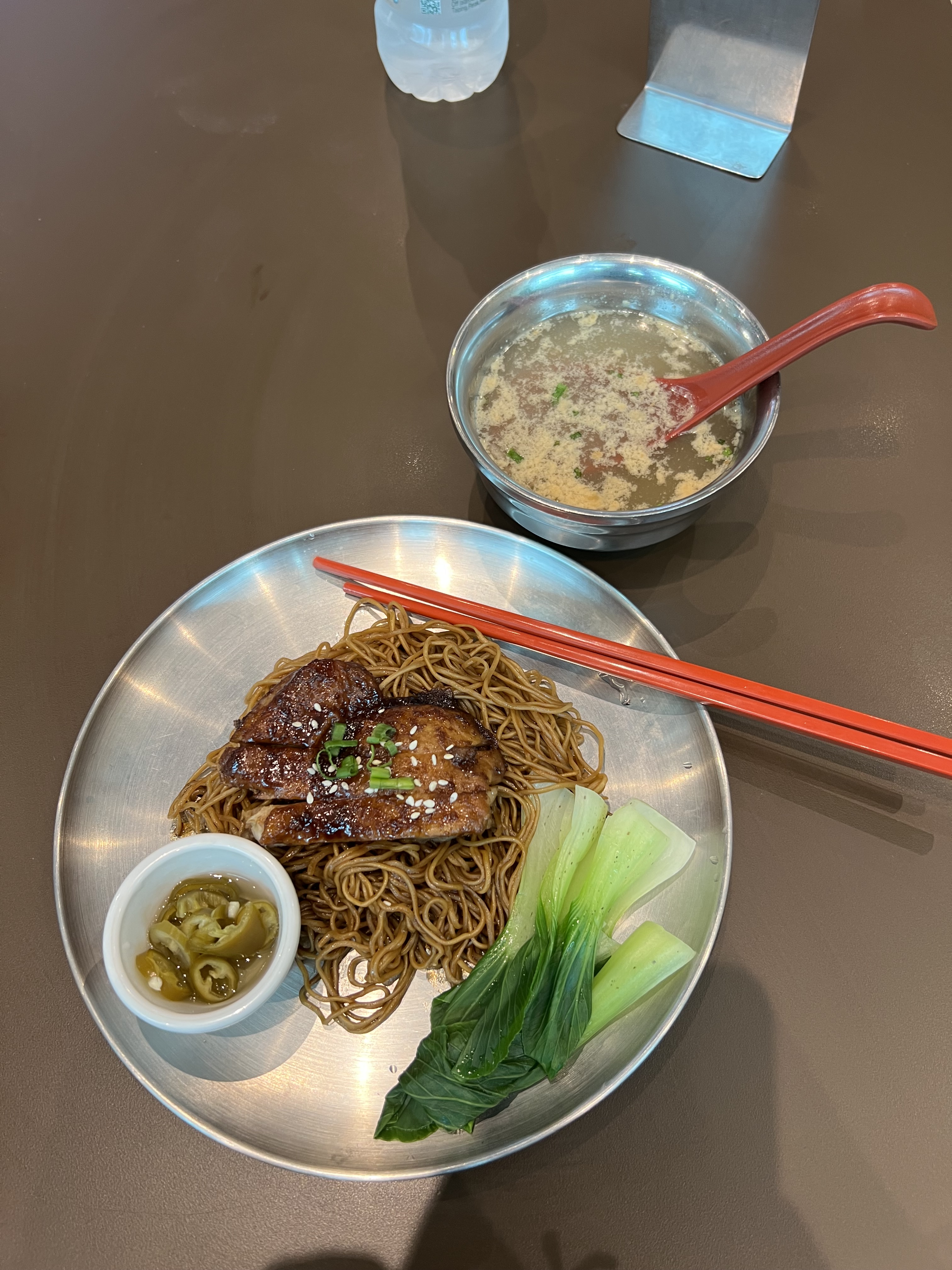 Entro in un ristorante tipico, attratto dal profumo che arriva fino al corridoio, e ordino un piatto di Wonton Noodles: noodles conditi con una salsa scura, carne glassata adagiata sopra e brodo caldo servito a parte. Il tutto per circa 5 euro, bevanda inclusa. Mangio con calma, assaporando i sapori speziati e intensi, pensando a quanto sarebbe impensabile un pasto simile in un aeroporto europeo a questo prezzo.