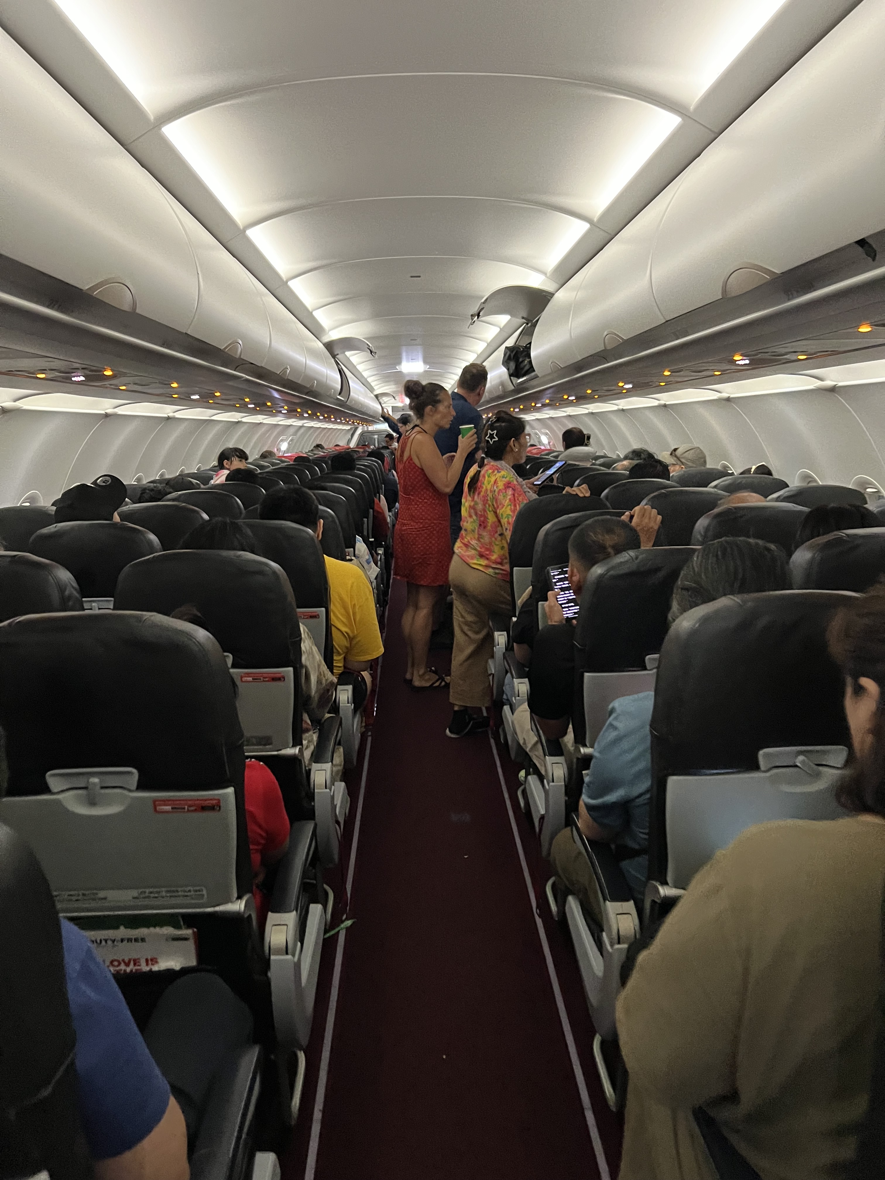 Atterriamo finalmente a Pattaya. Tiro un sospiro di sollievo. Ci dicono che non abbiamo potuto atterrare a Don Mueang a causa del maltempo. Il ritardo è ormai importante. Con altri passeggeri chiediamo di scendere, ma per motivi di sicurezza (e forse anche burocratici), non ci è concesso. Dovremo restare a bordo, in attesa della ripartenza per Bangkok.
