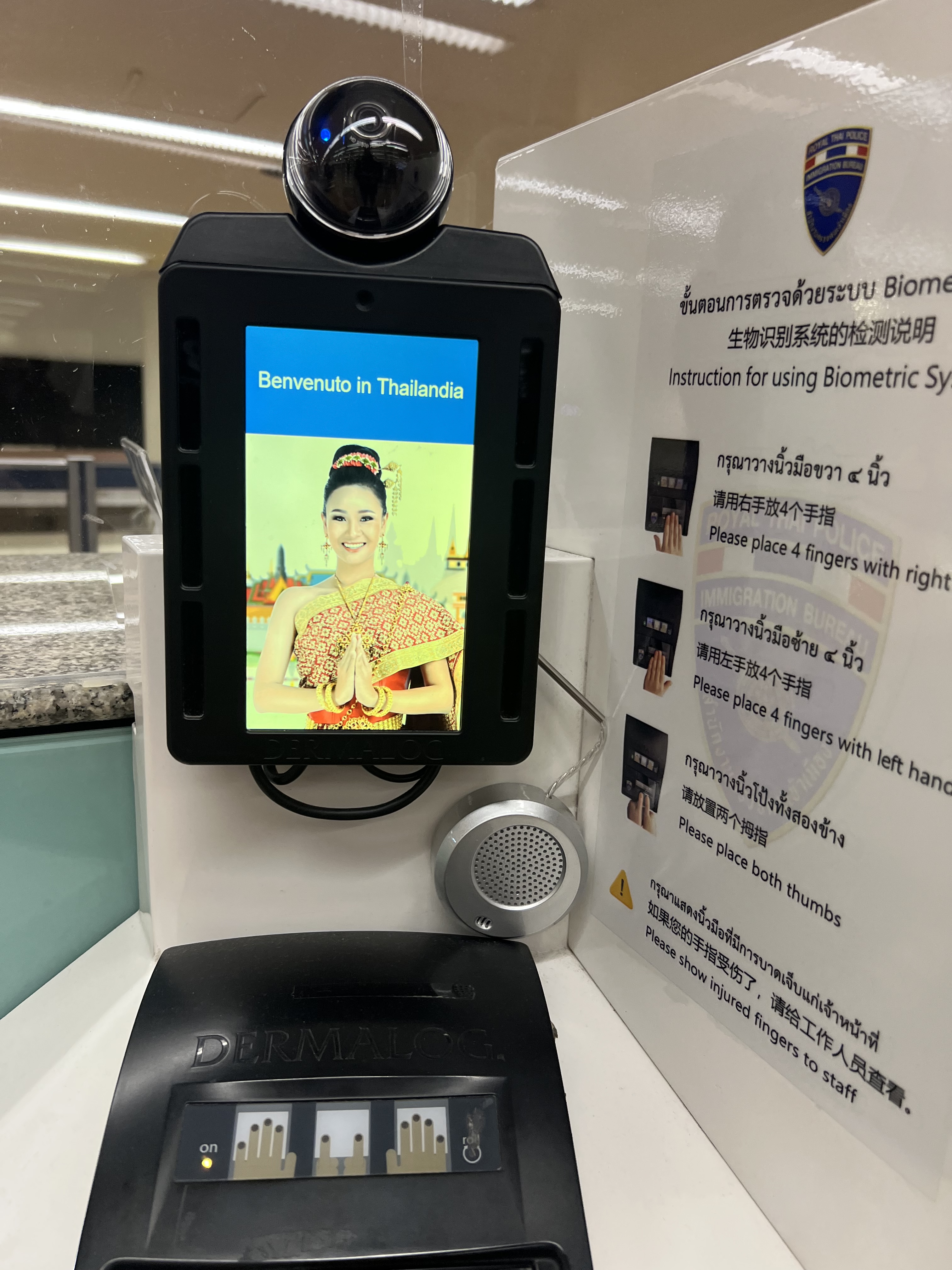 Mi avvicino ai controlli di frontiera. Passo al banco della polizia dove mi appongono il timbro sul passaporto: un gesto rapido ma sempre simbolico, un piccolo sigillo che segna l’inizio di una nuova avventura. Poco dopo arrivo al controllo biometrico: sullo schermo compare una donna thailandese sorridente, in abiti tradizionali, con le mani giunte davanti al petto. Sopra, una scritta sorprendente: