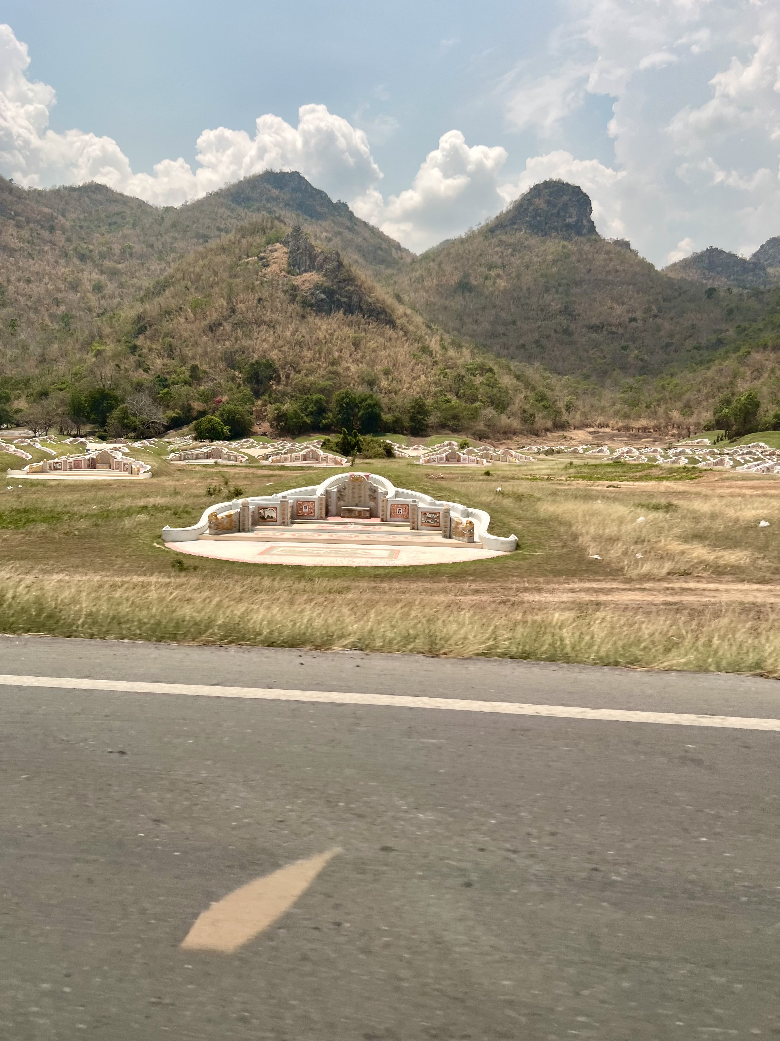Prenoto un Grab e mi faccio portare lì. Ripercorro strade già viste la sera prima: riconosco perfino il campeggio illuminato che avevo intravisto da lontano. Pian piano lasciamo la città, attraversiamo il ponte sul fiume Mae Klong e ci immergiamo nella natura. Lungo la strada noto delle costruzioni basse in mezzo al verde, senza recinzioni. Non capisco cosa siano, così chiedo all’autista: mi spiega che si tratta di un cimitero thailandese. Rimango sorpreso, non ne avevo mai visto uno prima.