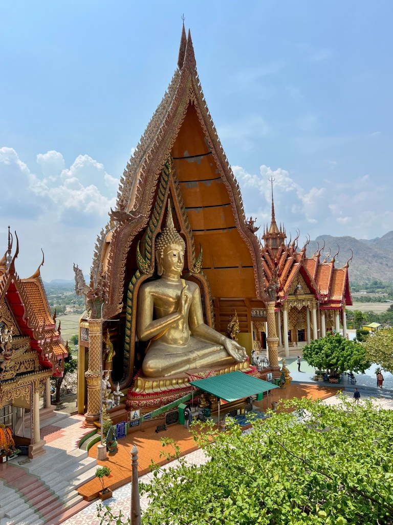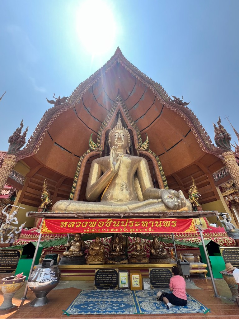 In cima, mi accoglie la visione straordinaria del Chin Prathanporn, una statua dorata di Buddha alta 18 metri e larga 10. È imponente. Nonostante il caldo e il sudore, un brivido mi attraversa la schiena. Resto lì, immobile, ad ammirarlo per diversi minuti. Il Buddha è nella posizione del Vitarka Mudra, il gesto che simboleggia l’insegnamento e la trasmissione della conoscenza.