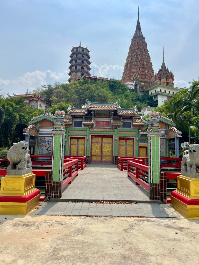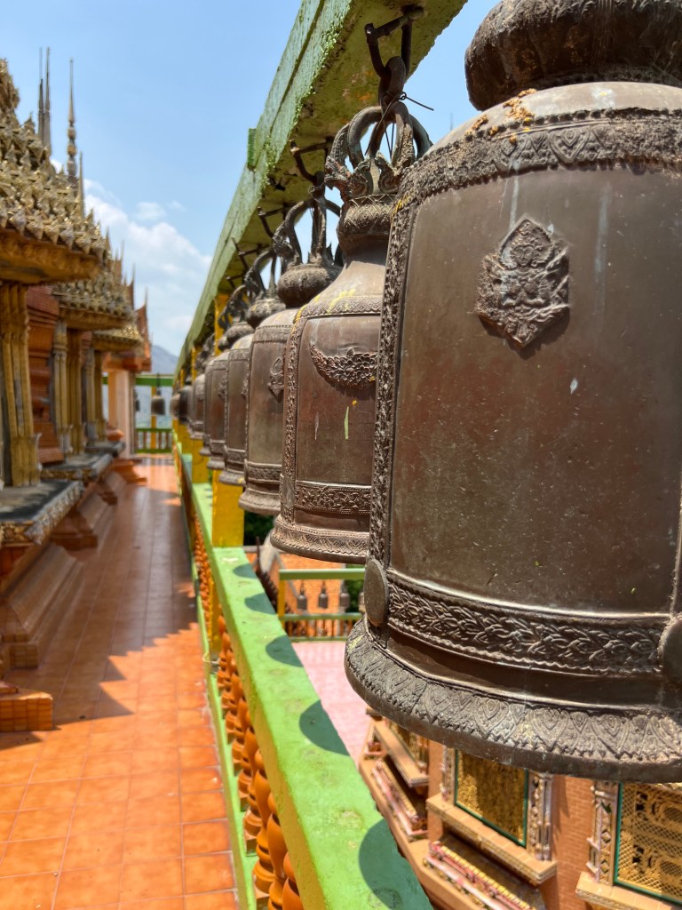 Il bus parte alle 15:30, ma prima voglio concedermi una visita al Wat Tham Suea, il “Tempio della Grotta della Tigre”. Situato a una ventina di chilometri dalla città, il tempio è famoso per la sua immensa statua dorata del Buddha, visibile da lontano, e per la grotta un tempo usata dai monaci per la meditazione. La salita conta ben 157 gradini, oppure, in alternativa, c’è una funivia. Dalla terrazza si gode una vista mozzafiato sul fiume Kwai e sui campi verdi che lo circondano. Accanto sorge anche il Wat Tham Khao Noi, un elegante tempio cinese con una pagoda a sette piani.