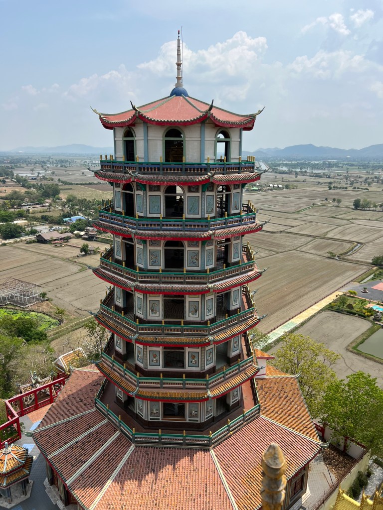 Uscito dalla pagoda, mi dirigo verso il vicino Wat Tham Khao Noi. La sua pagoda, anch’essa di sette piani ma più regolare, mantiene la stessa ampiezza fino in cima. Anche da lì la vista è spettacolare: campagna, fiumi e templi che si perdono all’orizzonte.