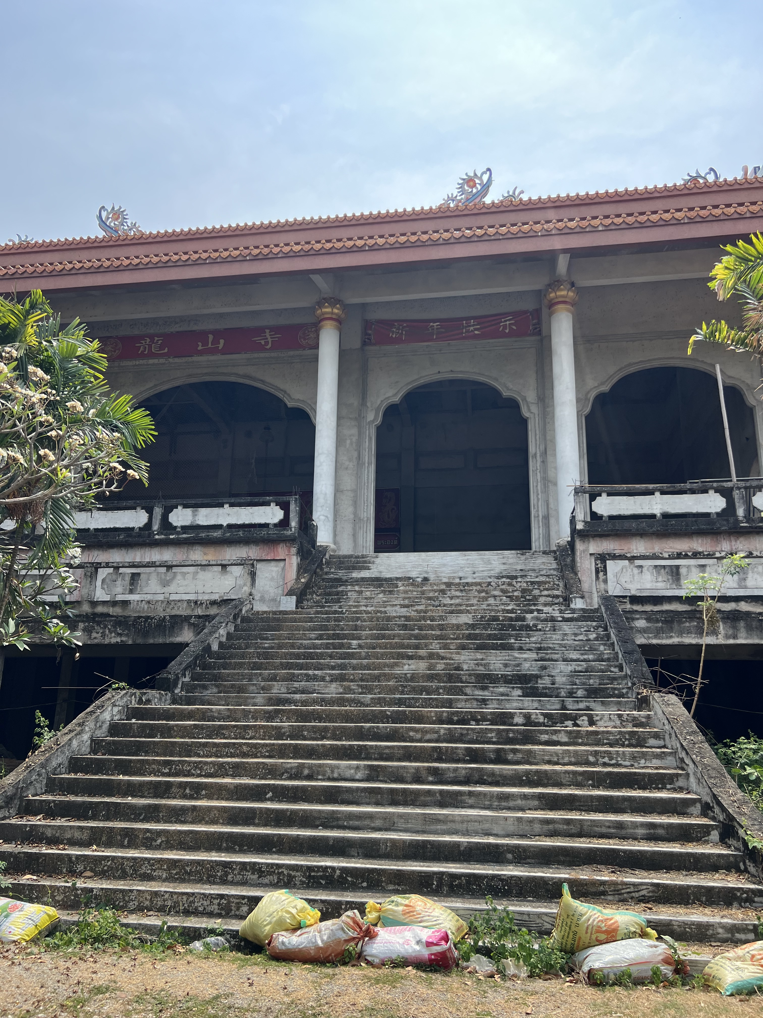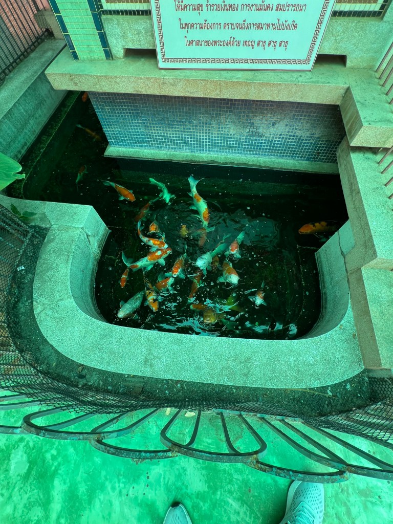 Dopo quasi due ore di visita, scendo la lunga scalinata. Questa volta il piazzale è affollato: sono arrivati un paio di autobus carichi di turisti. Percorro la parte cinese del complesso, passo davanti a un piccolo tempio abbandonato con statue logorate dal tempo e a una vasca d’acqua colma di carpe colorate.