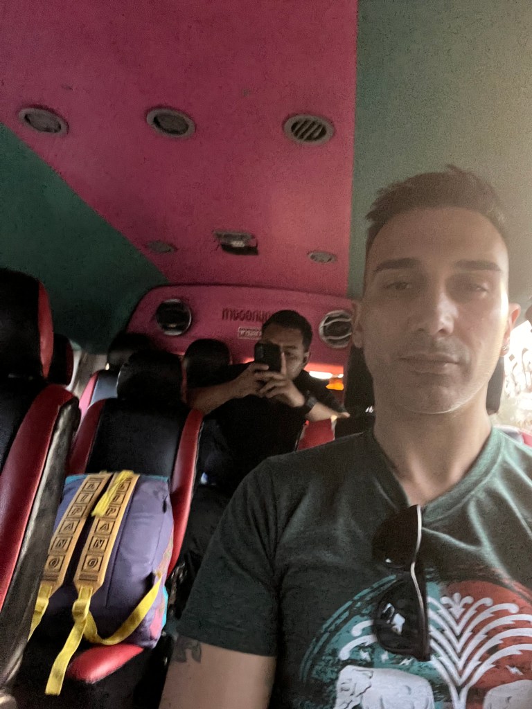 Parlo con l’autista, che mi dice che parte tra dieci minuti. Il tempo di andare in bagno, fumarmi una sigaretta, pagare e salire a bordo. Dentro noto subito che questo minivan è molto più sistemato rispetto al precedente, che era piuttosto umile. I sedili sono in pelle, molto comodi, e ci sono luci dappertutto: davvero carino. La disposizione è la stessa, quindi sistemo lo zaino come avevo fatto prima.
