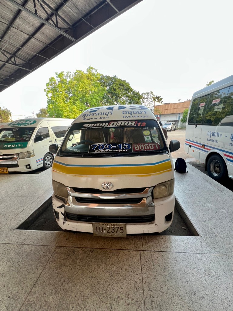 Scendo, recupero lo zaino e mi sgranchisco le gambe, poi subito mi metto a cercare il mezzo per Ayutthaya. Giro tra le piazzole, tra le scritte quasi tutte in thai, finché non scovo in piccolo la parola Ayutthaya. Non è scritta su un bus, ma su un altro minivan. Capisco subito che mi aspetta un altro viaggio su quei piccoli e accoglienti mezzi.