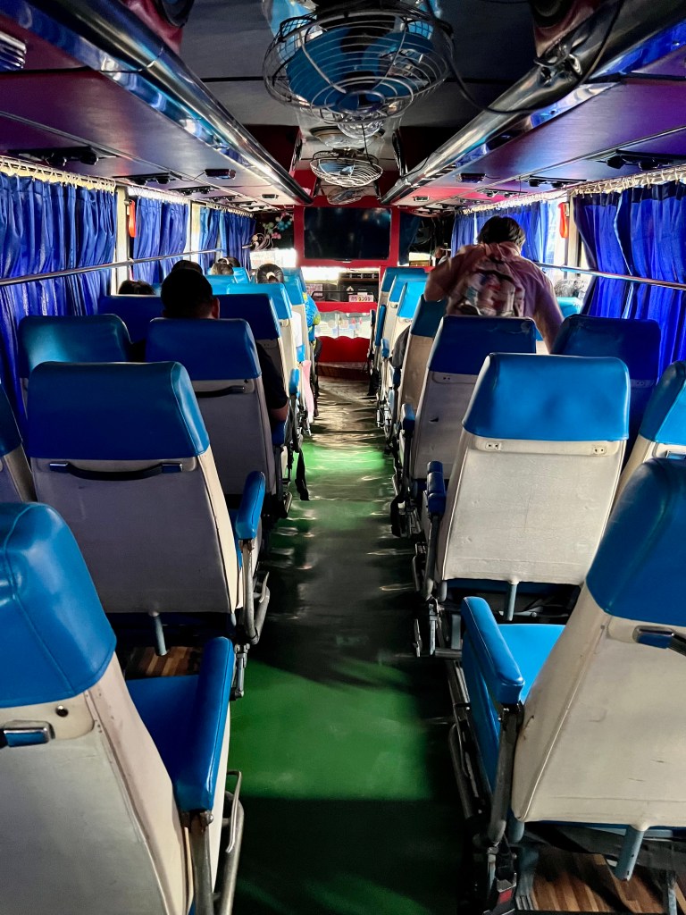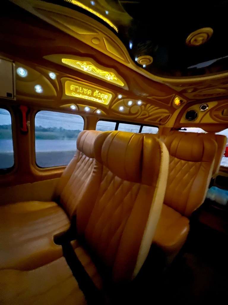 Il mezzo è piccolo e stretto, e non c’è spazio per il mio zaino. È comodo da portare in giro, ma ingombrante per un minivan così. Fortunatamente sono l’unico ad averne uno grande: gli altri, tutti thailandesi pendolari, hanno piccoli zainetti o addirittura nulla. Riesco a sistemarlo su un supporto dietro al sedile passeggero, accanto all’autista, e lo assicuro con una spallina al poggiatesta per evitare che cada all’indietro.