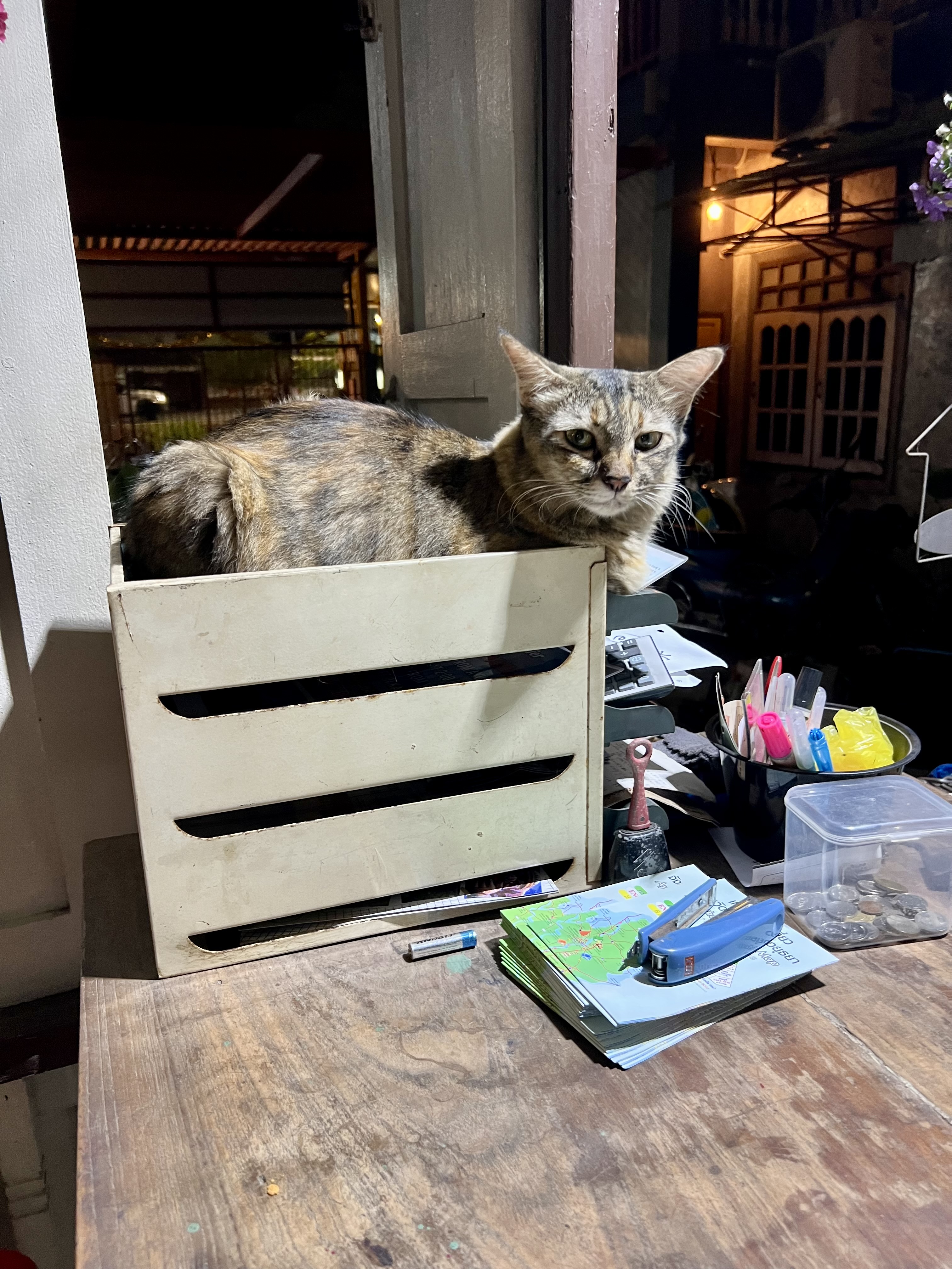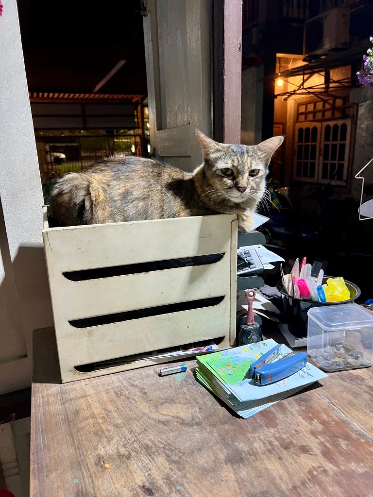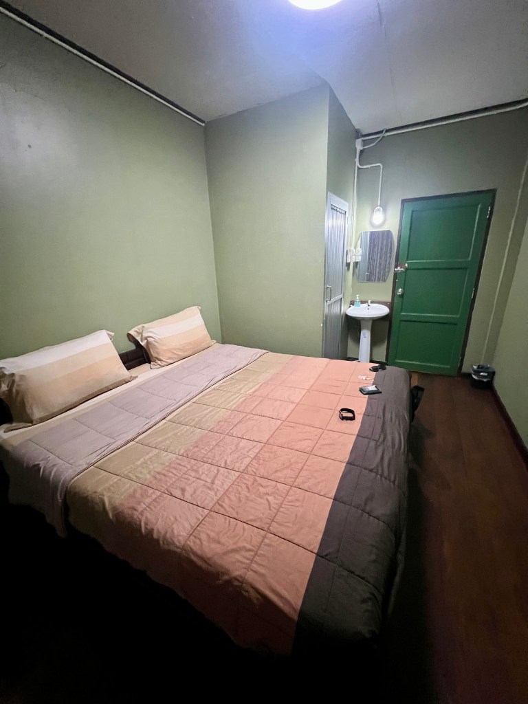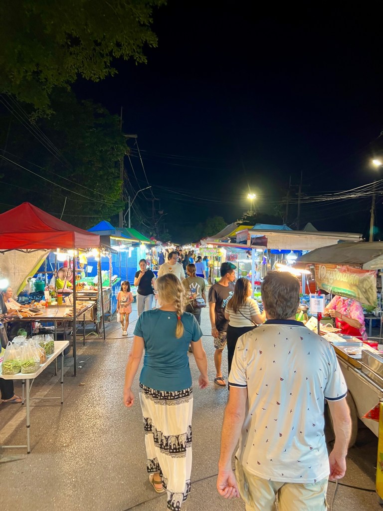 Prima di accompagnarmi in camera, mi mostra i gattini residenti della struttura, piccole palline di pelo che si aggirano curiose. Mi apre la stanza e mi saluta: ripeto gesti ormai familiari. Apro lo zaino e tiro fuori l’essenziale per una doccia e un cambio. Dopo la doccia, pronto per uscire, guardo l’orologio: sono le 20.30. L’aria è serena e tranquilla. Apro Google Maps e mi dirigo verso il Night Market della città. Qui sembra esserci ancora meno gente che a Kanchanaburi; lontano dal caos della capitale, cammino lentamente, godendomi la pace.