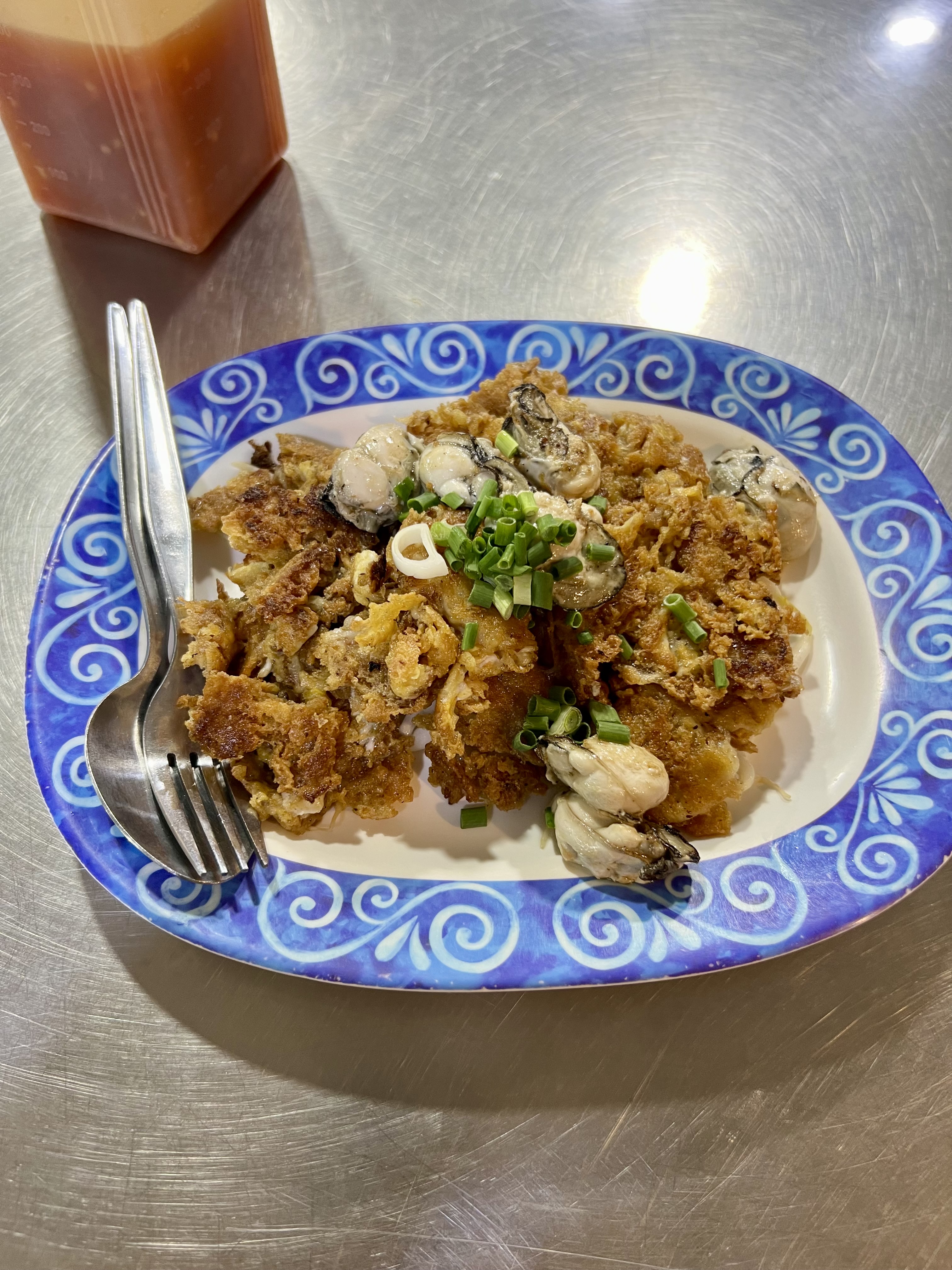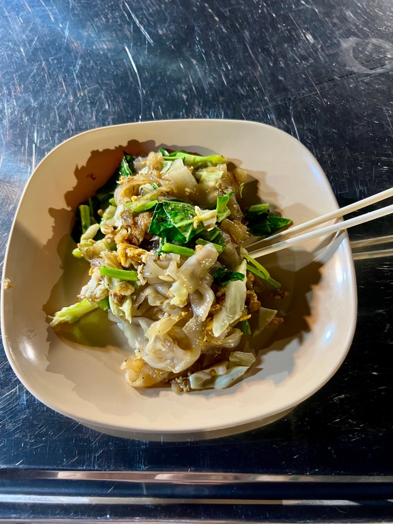 Dopo una decina di minuti arrivo al night market, piccolo ma vivo, un mix tra turisti e locals. Faccio un giro e compro un succo d’arancia fresco. Poi trovo una bancarella gestita da una famiglia e mi siedo: tavolini bassi e sedie di plastica. La ragazzina, circa 12 anni, mi porge il menu. Scelgo un’omelette di ostriche, fatto con uova, ostriche fresche e spesso accompagnato da una salsa, e un pad see ew, un popolare piatto di noodles stir-fry della cucina thailandese. È fatto con noodles larghi di riso, verdure (come cavolo e cime di rapa), uova e una salsa a base di soia. Mangio lentamente, grato per la giornata appena trascorsa. La famiglia thailandese che gestisce il locale ne approfitta per cenare accanto a me e un cane randagio aspetta paziente la sua porzione. Mi godo il fresco della serata e la pace, in silenzio, solo con me stesso.