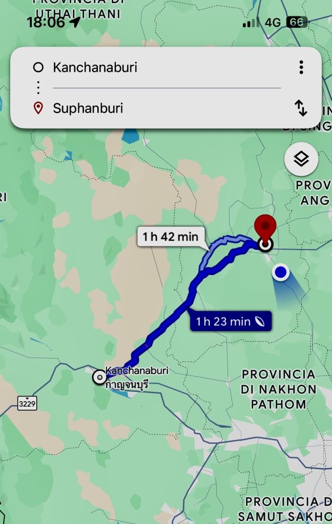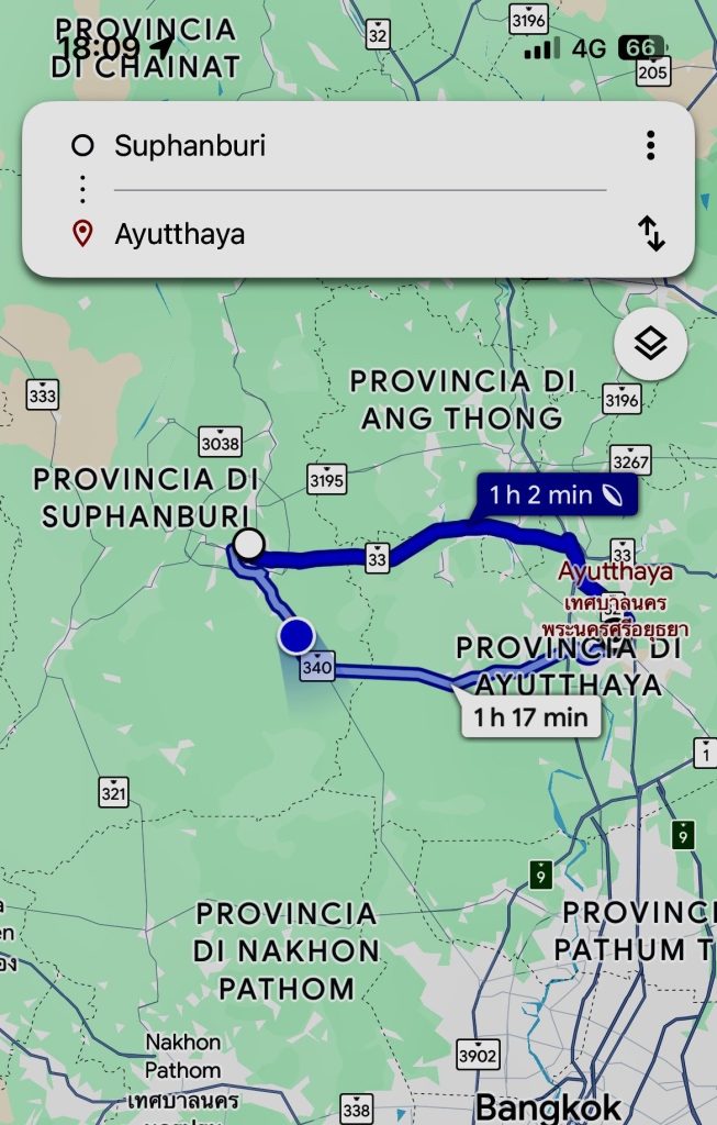 Dopo circa un’ora e mezza di strada e qualche fermata casuale, l’autobus si ferma e l’autista ci fa scendere tutti in mezzo a un crocevia di un piccolo villaggio. Recupero lo zaino e rimango spaesato su quello stradone, senza indicazioni. Apro Google Maps: sono a U Thong, ma mancano ancora una trentina di chilometri per arrivare a Suphanburi. Eppure l’autista si limita a farmi segno di scendere. Confuso, gli mostro il biglietto. Lui sorride e mi spiega a gesti che dovrò aspettare un minivan che mi porterà a destinazione.