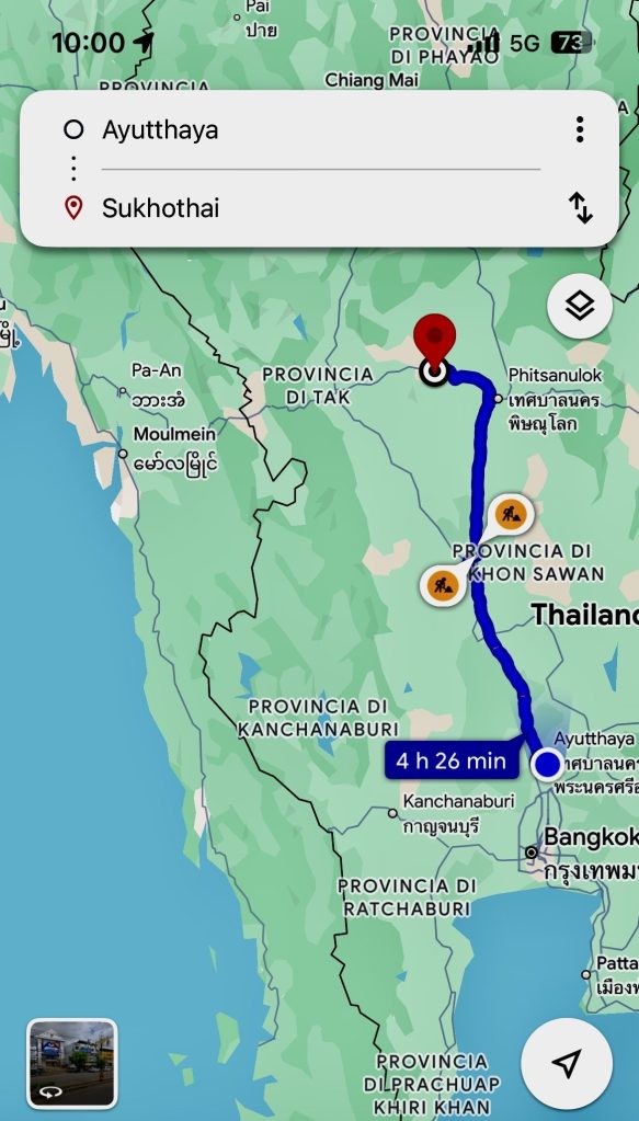 Dopo un paio d’ore facciamo una sosta in una stazione di servizio all’aperto, con qualche negozio e un paio di ristoranti. Ne approfitto per andare in bagno. Poi risaliamo a bordo e, intorno alle 16.00, arriviamo a Sukhothai.