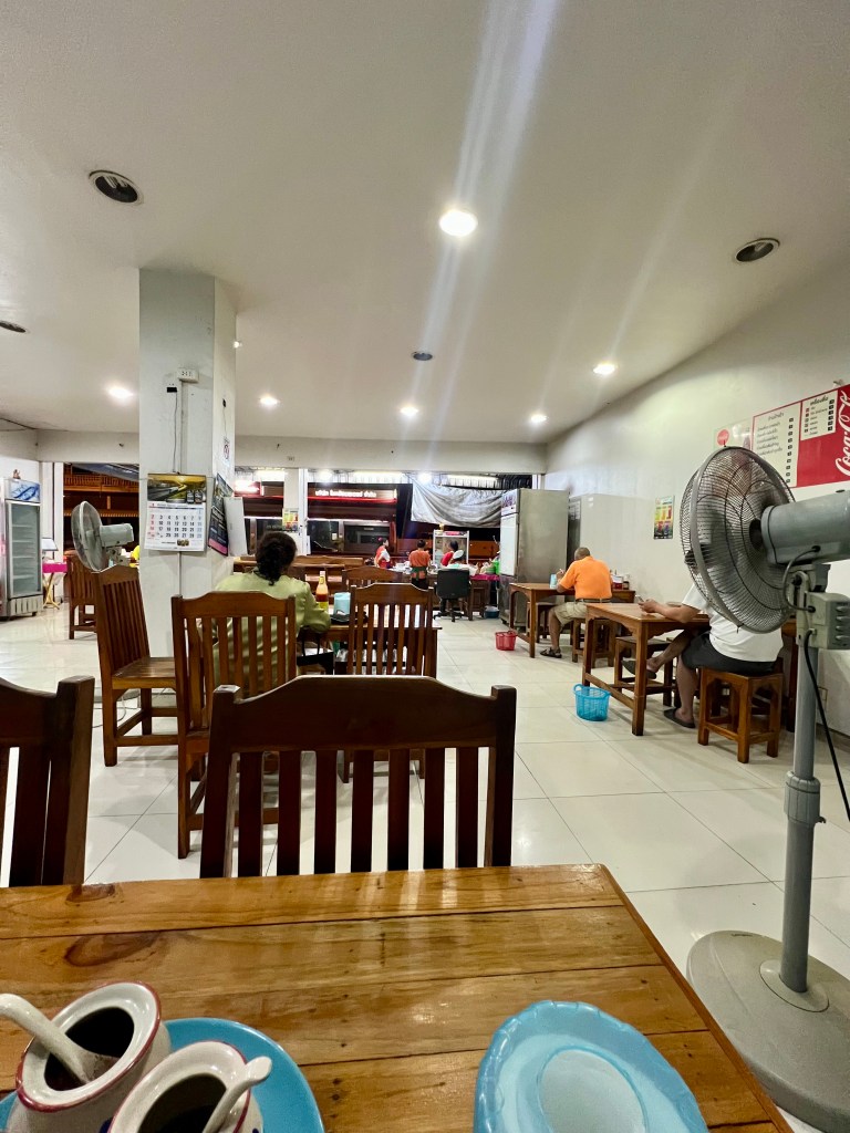 Mi avvicino. Dietro al banchetto si apre un grande stanzone illuminato, pieno di tavoli e sedie in legno, un ristorantino locale a conduzione familiare. Probabilmente la famiglia vive proprio al piano di sopra. Sul banchetto vedo il menù, tutto scritto in thailandese ma con immagini dei piatti. Una signora anziana, una delle cuoche, mi invita a entrare.