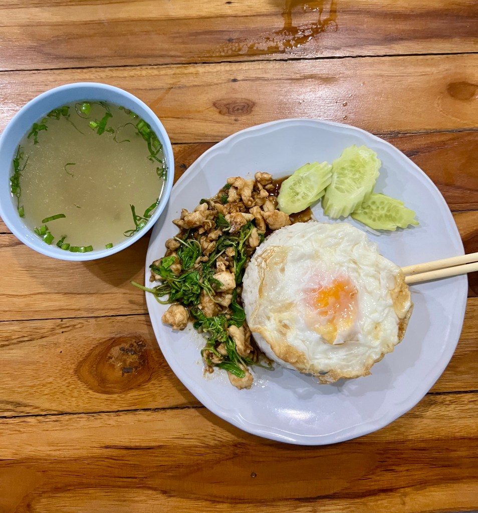 Mi siedo in fondo alla sala. Attorno a me ci sono solo thailandesi: il segnale che sono finito nel posto giusto. Scelgo di ordinare un Pad Thai, un Pad Krapow Gai (pollo tritato con basilico santo, aglio, peperoncino, verdure e uovo fritto su riso bianco) e una zuppa di pollo con erbe fresche.