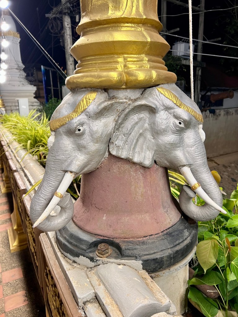 Arrivo al ponte e mi affaccio: sotto scorre il Mae Nam Yom, il fiume che taglia la città. I pali della luce che costeggiano il ponte sono decorati da teste di elefante. Resto lì qualche minuto, respirando quell’atmosfera sospesa, poi torno indietro.