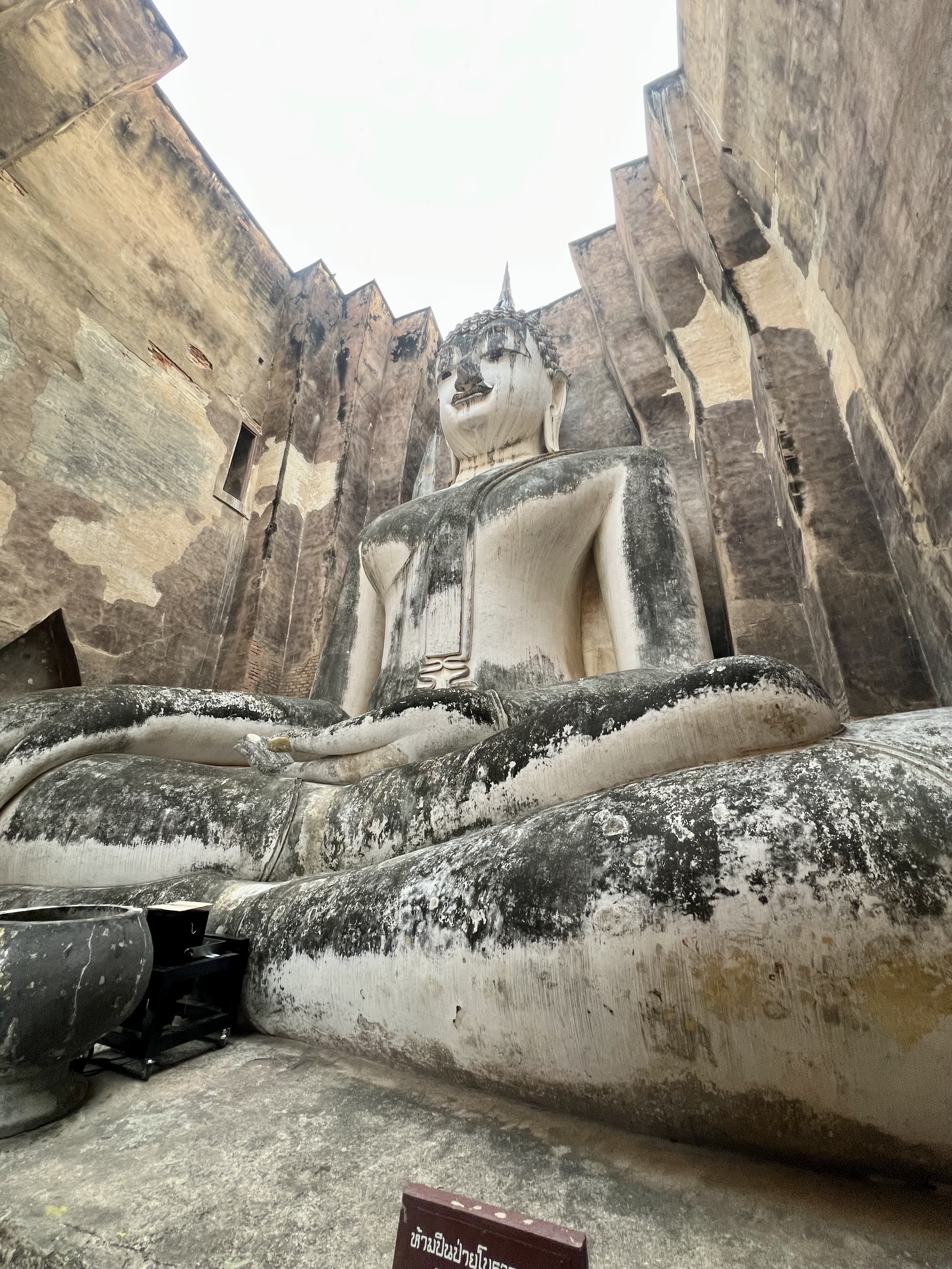 Dopo aver esplorato il parco scopro che, a circa due km fuori dalle mura, si trova un tempio importante: il Wat Si Chum. Salto in bici e ci arrivo in un quarto d’ora. Qui c’è più gente. In fondo, all’interno di un wihan quadrato, si trova un enorme Buddha di 10×12 metri, visibile entrando da una fessura stretta. L’impatto è fortissimo: resto lì a contemplare la statua, immerso in un momento di sacralità pura.