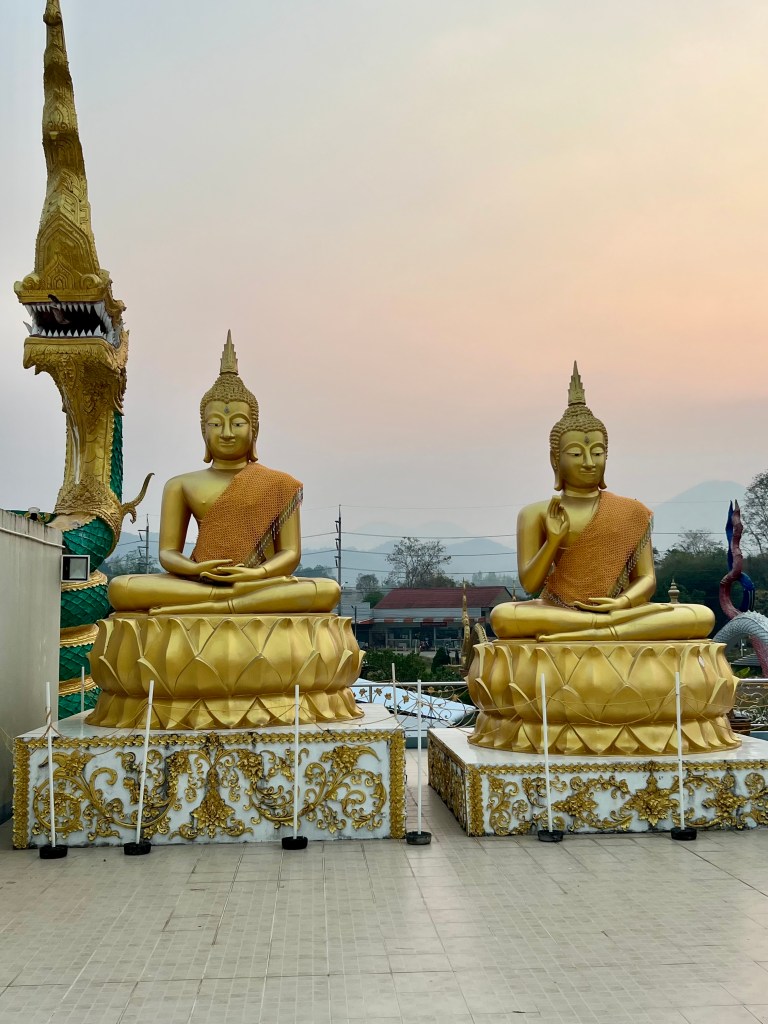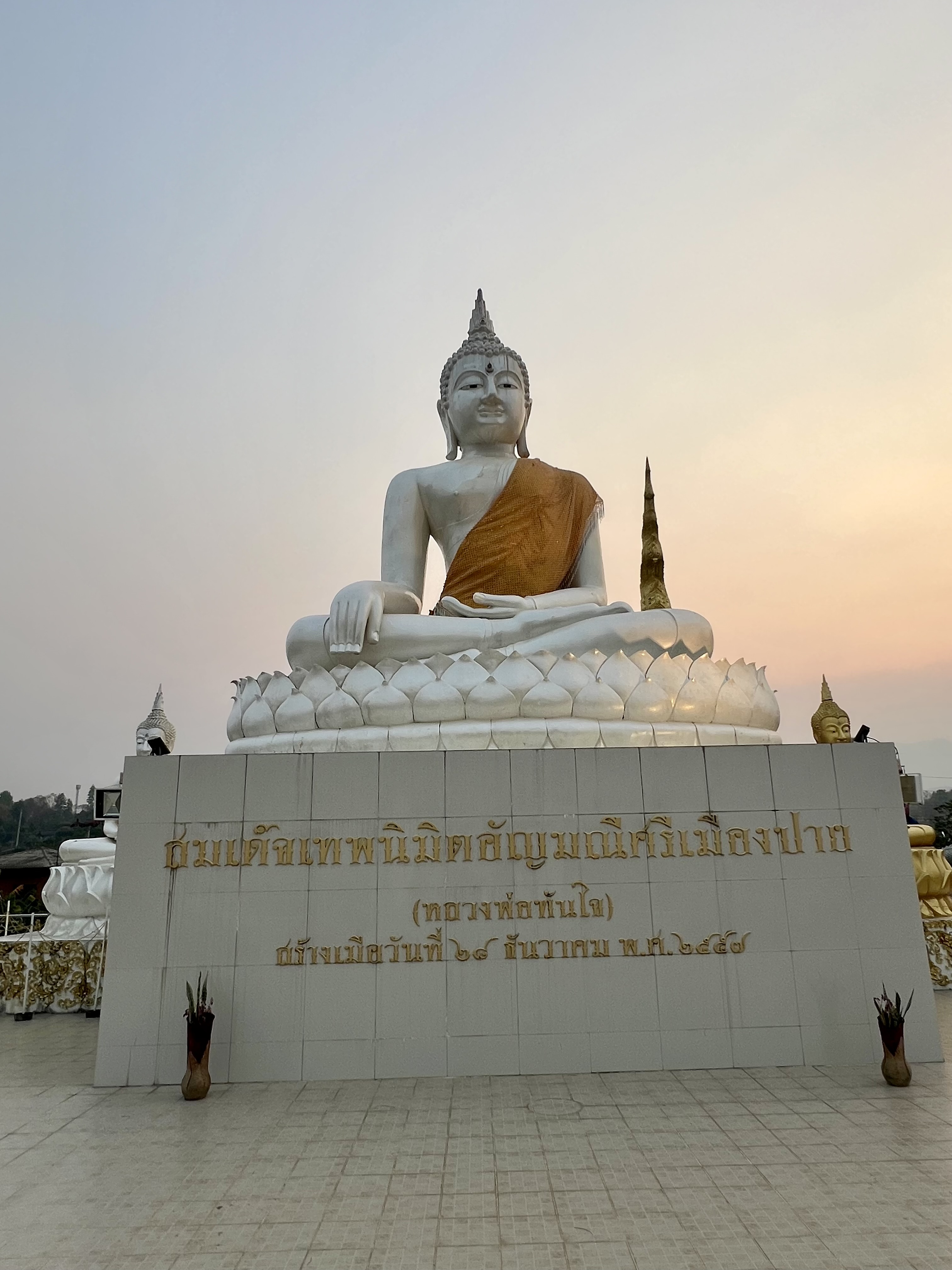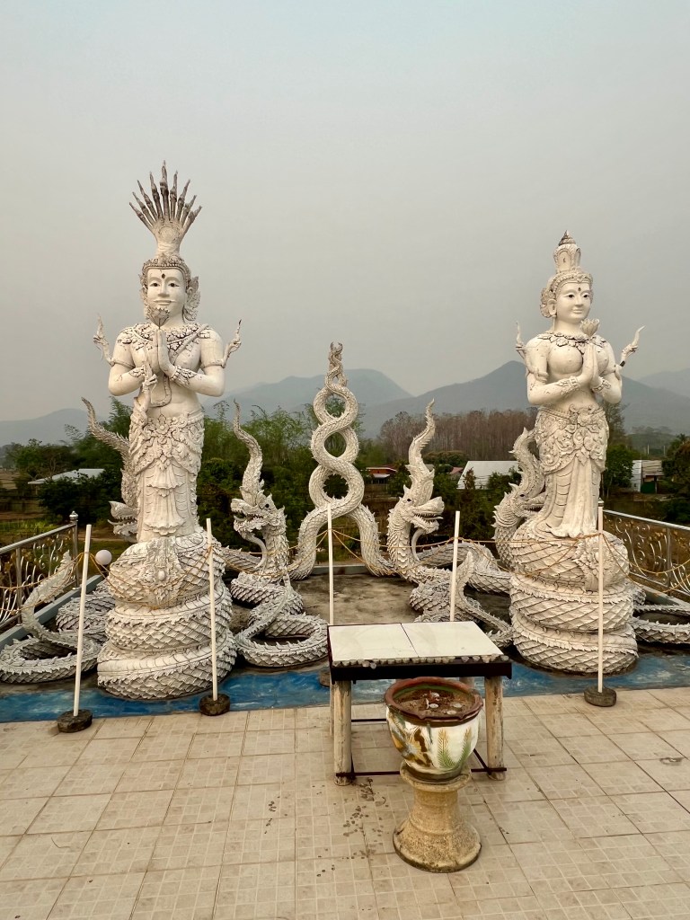 Resto qualche minuto ad assorbire quel panorama, poi decido di continuare a pedalare lungo la stessa strada. Ancora salite, ancora discese. L’aria è fresca e profuma di natura. Dopo un po’ arrivo al Wat Mai Huai Sai, dove si erge il White Buddha, una grande statua bianca che domina la valle.