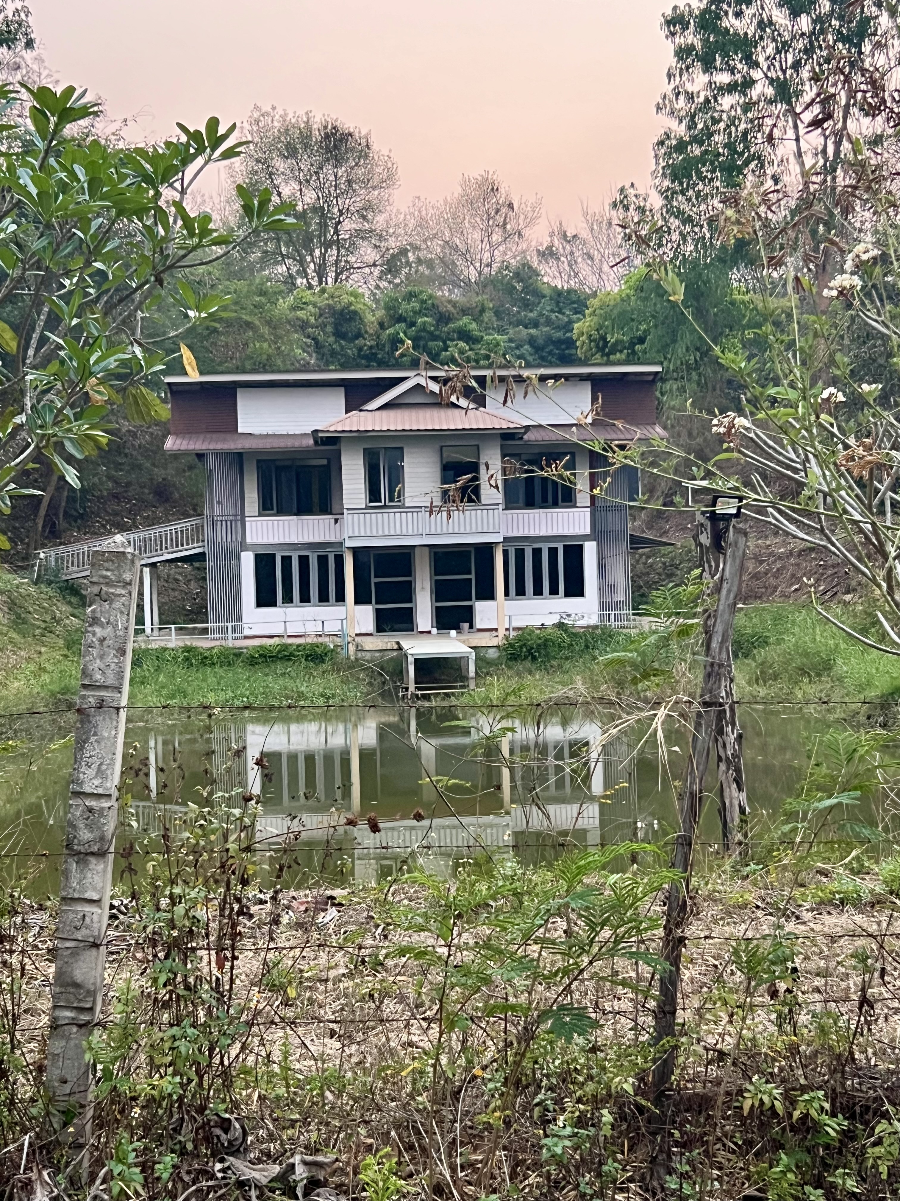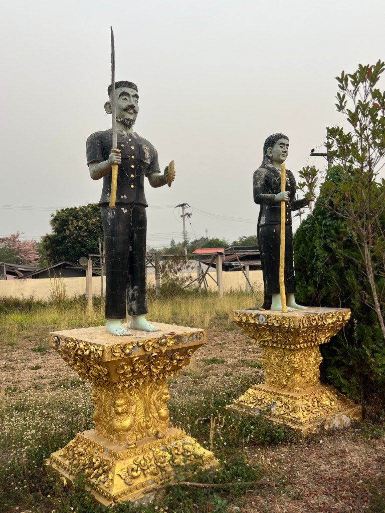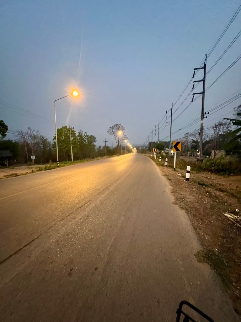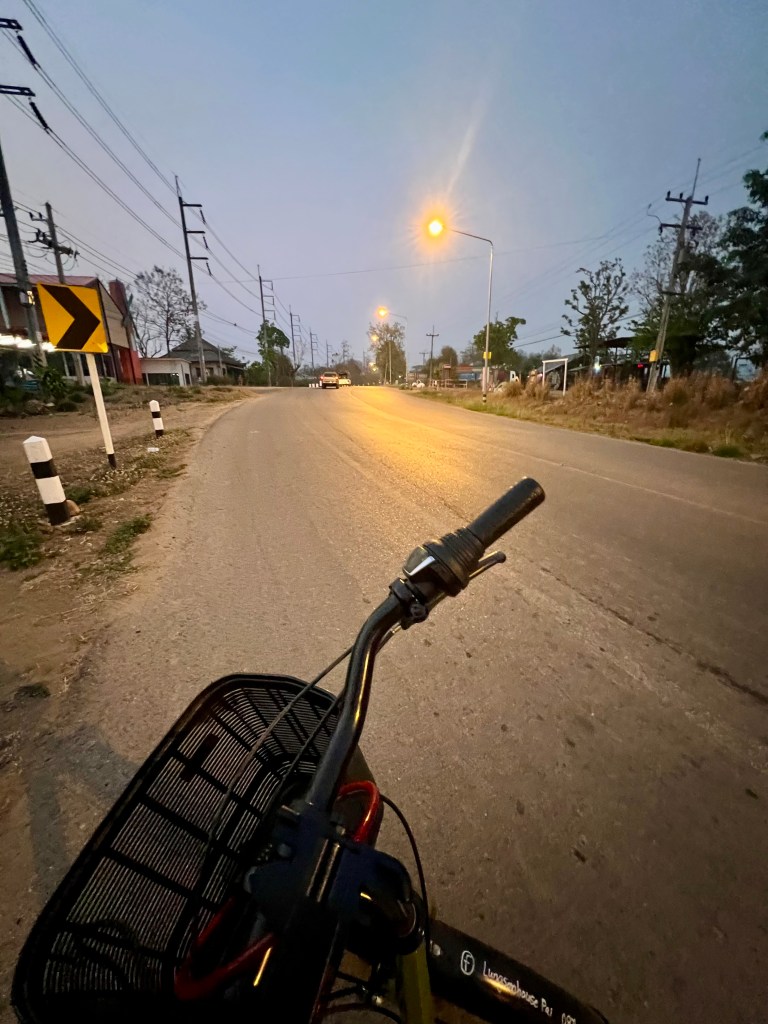 Il sole inizia lentamente a scendere dietro le colline, tingendo tutto di arancio e oro. Decido di rimettermi in sella e tornare verso Pai. Prendo una strada interna, quella che passa alle spalle della statua del White Buddha. È sterrata, ma percorribile, e dopo qualche centinaio di metri mi ritrovo letteralmente in mezzo al nulla. Una casa che sembra abbandonata e poi solo la natura e, in lontananza, alcuni cani che iniziano ad abbaiare.