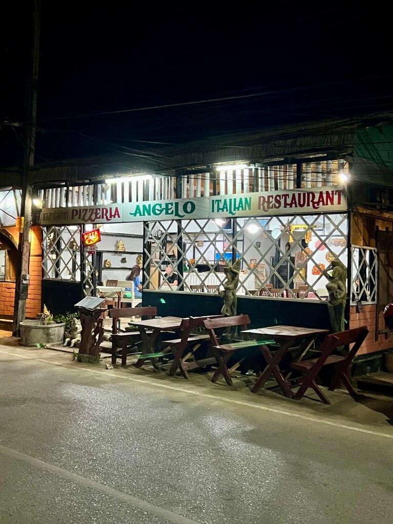 Tra le tante bancarelle di street food e ristoranti locali, mi allontano un po’ dal cuore del villaggio e mi imbatto in una pizzeria italiana. Non avevo intenzione di mangiare pizza, ma la curiosità di assaggiarne una in Thailandia è più forte di me. Entro e mi siedo.