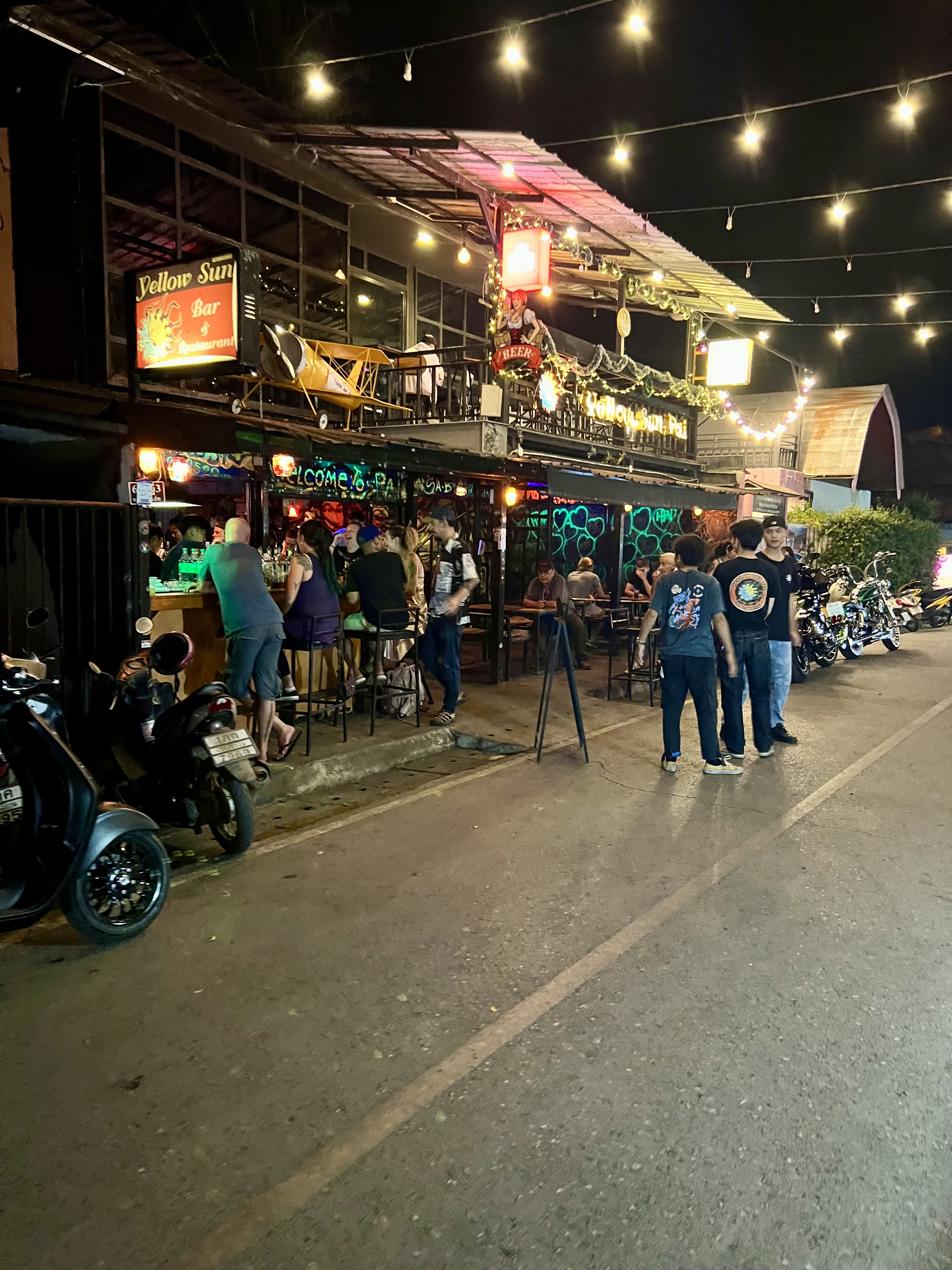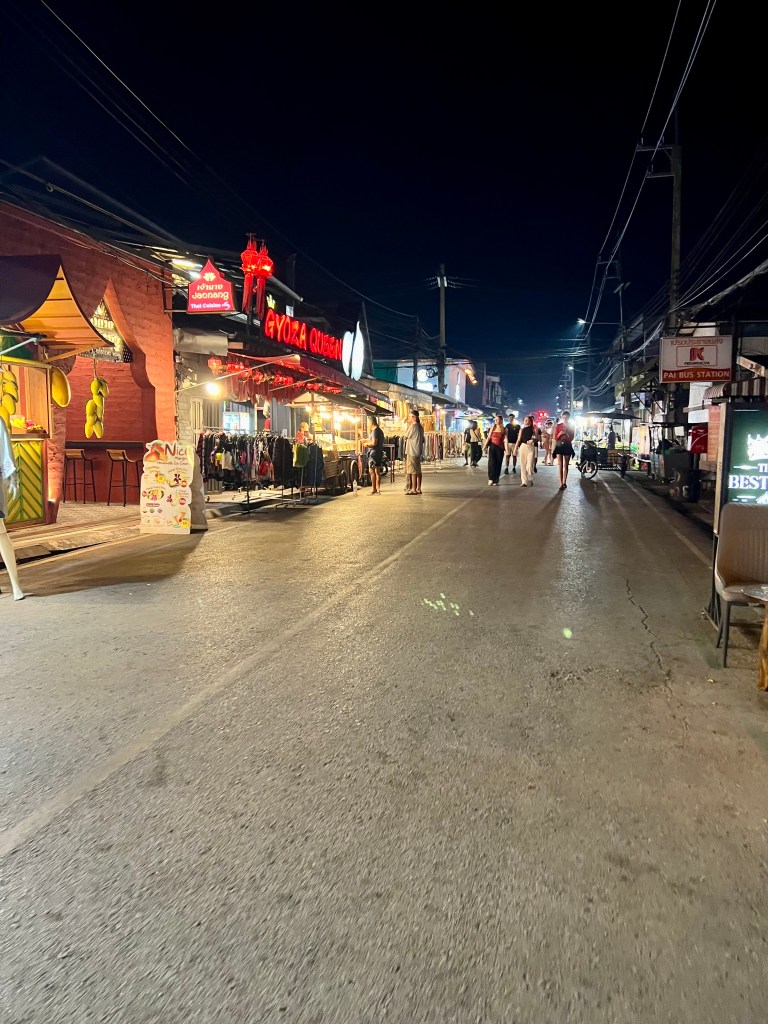 Rispetto al pomeriggio, quando avevo visto una Pai quasi deserta, di sera il villaggio sembra rinascere. Le strade si animano, i locali iniziano a riempirsi e le luci colorate si accendono, regalandomi una nuova immagine del luogo: una Pai notturna, viva e accogliente.
