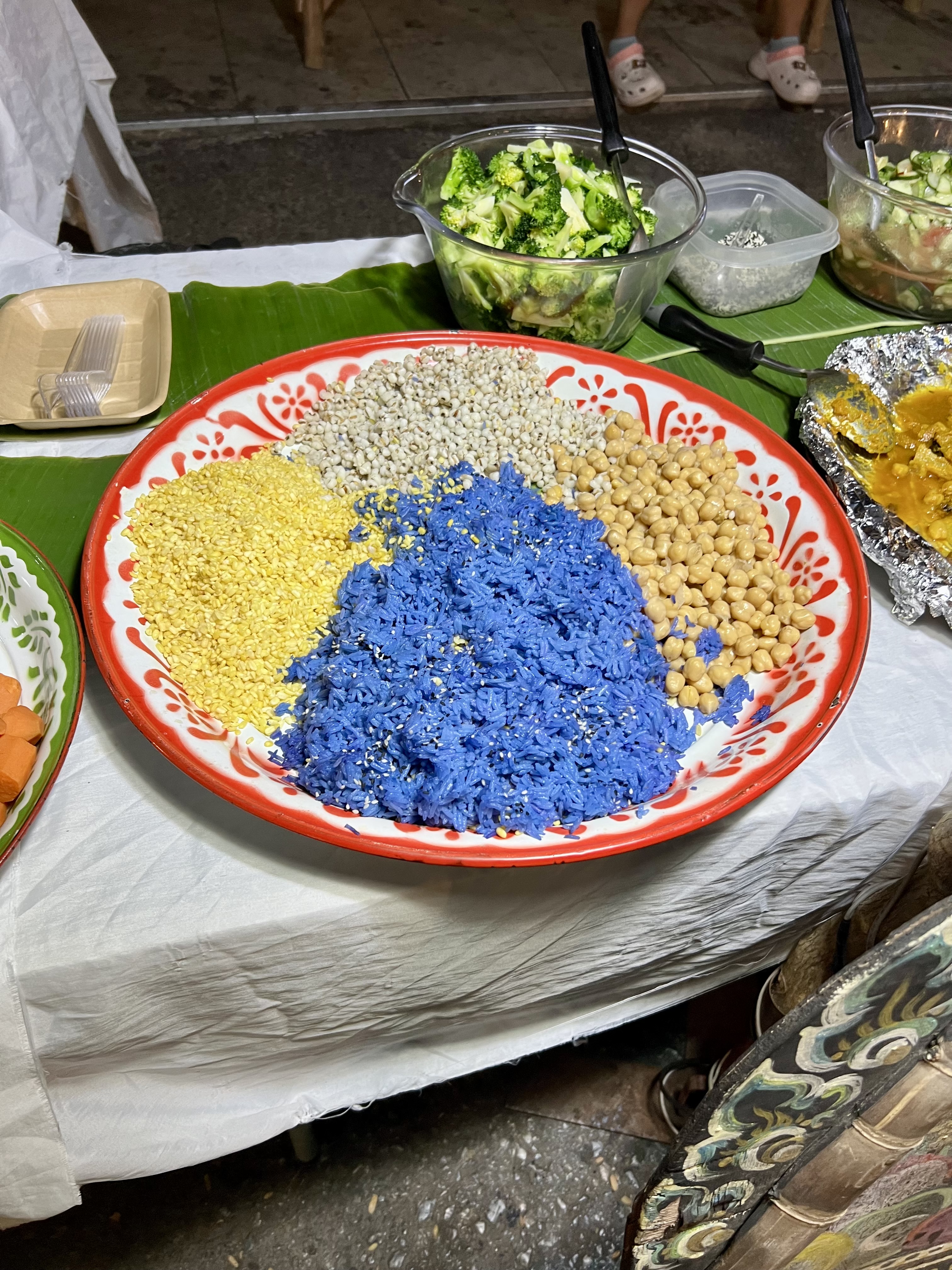 Camminando, passo davanti a una bancarella di street food che cattura la mia attenzione. Sul bancone vedo piatti colorati di ortaggi, pollo marinato e riso blu e giallo, accostato a farro e ceci. Mi fermo, incuriosito. Chiedo alla ragazza cosa siano quei colori così intensi. Lei sorride e mi spiega che il blu del riso è ottenuto dai fiori freschi di Clitoria ternatea, mentre il giallo proviene dalla curcuma.