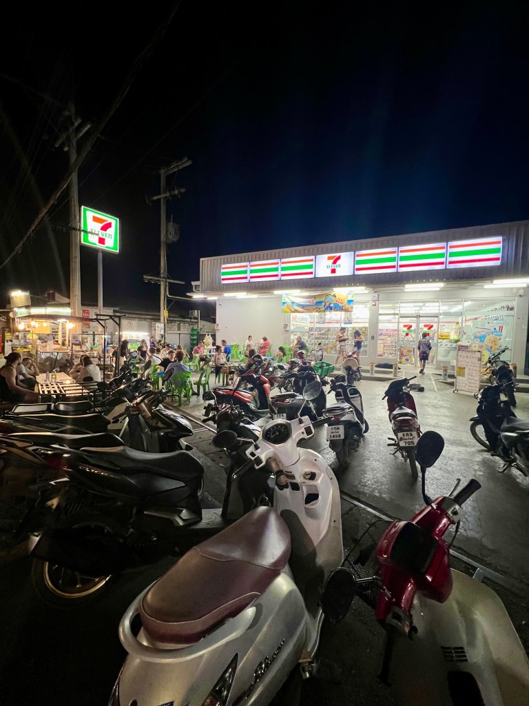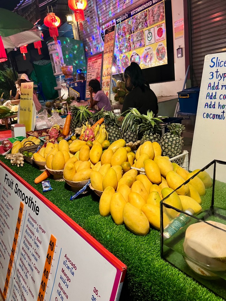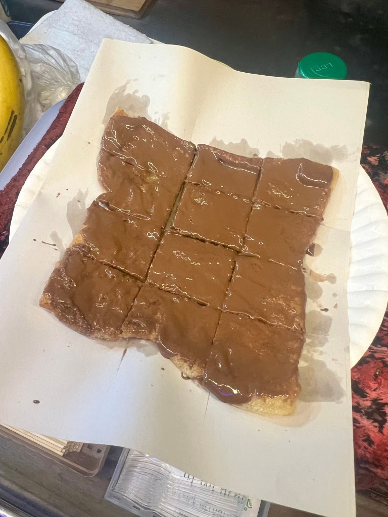 Riprendo il cammino e incontro altre bancarelle, questa volta di frutta e dolci. Mi fermo davanti a un banchetto dove un uomo prepara roti con Nutella. Non resisto e ne ordino uno. Mi siedo sul marciapiede, proprio fuori da un 7-Eleven, e lo mangio con calma. È squisito.