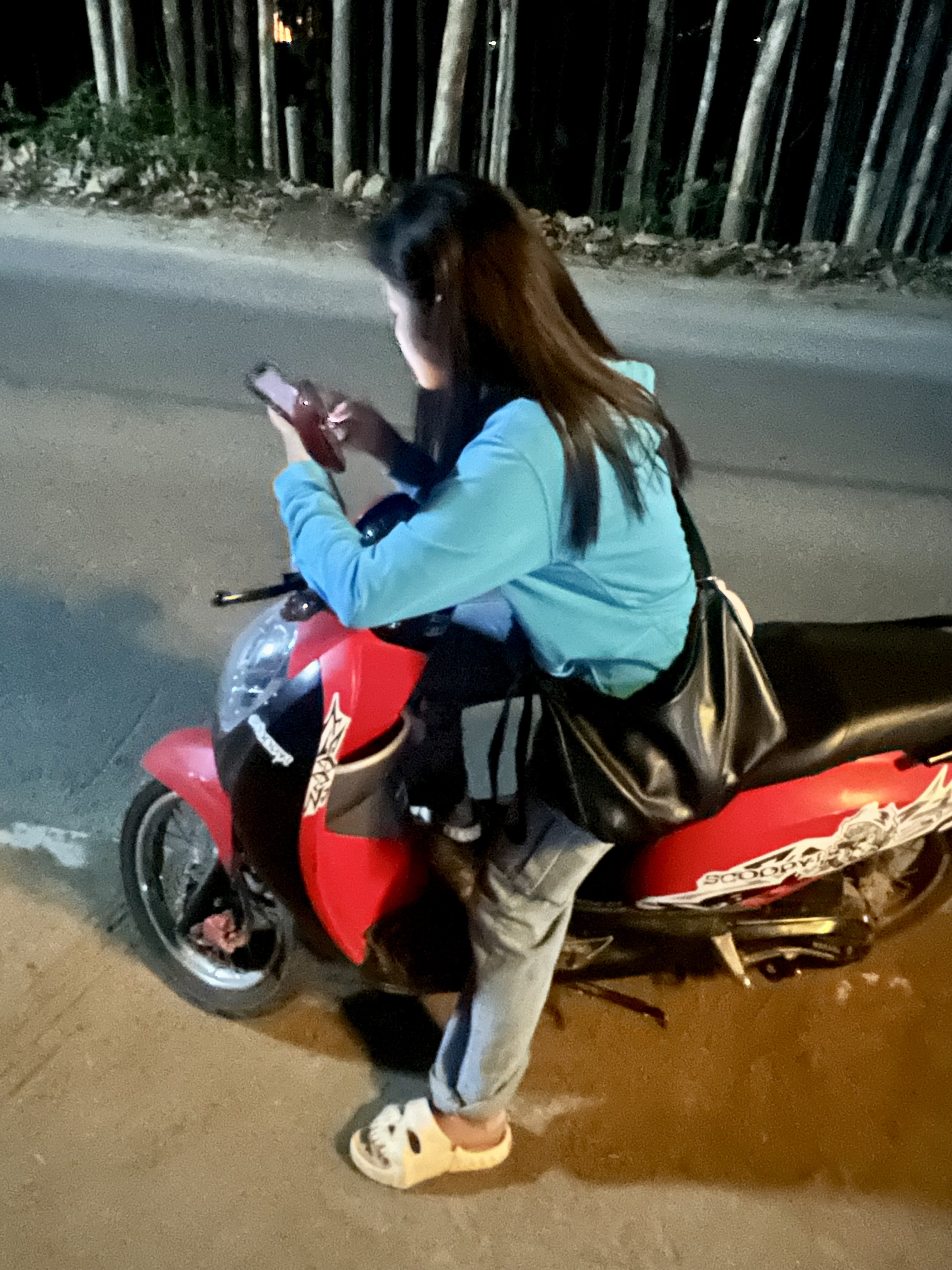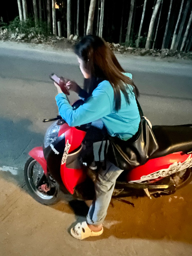 La ragazza monta in sella, mi saluta con il suo sorriso thai e scompare nella notte.
