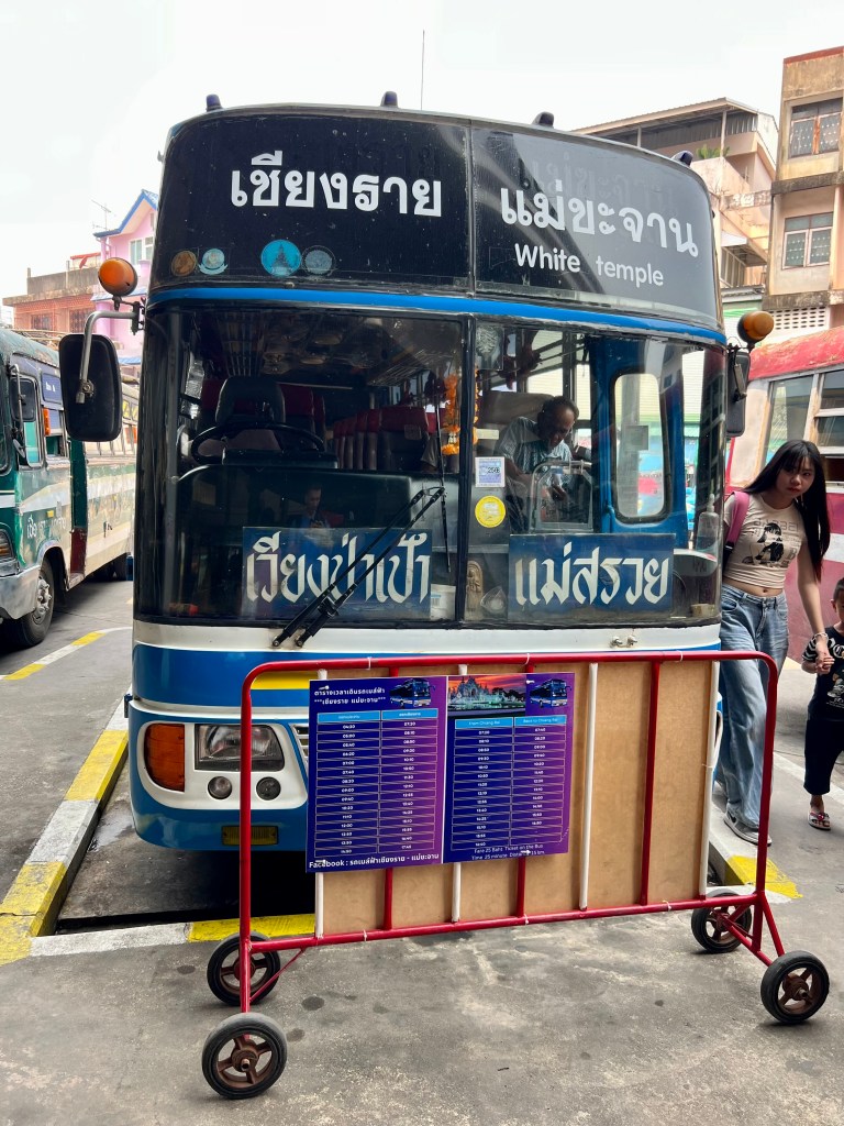 Arrivato alla stazione mi trovo davanti a una ventina di banchine. Ovunque bus locali, quasi tutti con scritte solo in lingua thai. Per un attimo resto fermo a osservare, poi mi avvicino a un poliziotto — o forse un vigile urbano — e gli chiedo informazioni. Mi ascolta, sorride e mi indica un bus di colore blu. Lo ringrazio e mi avvicino.