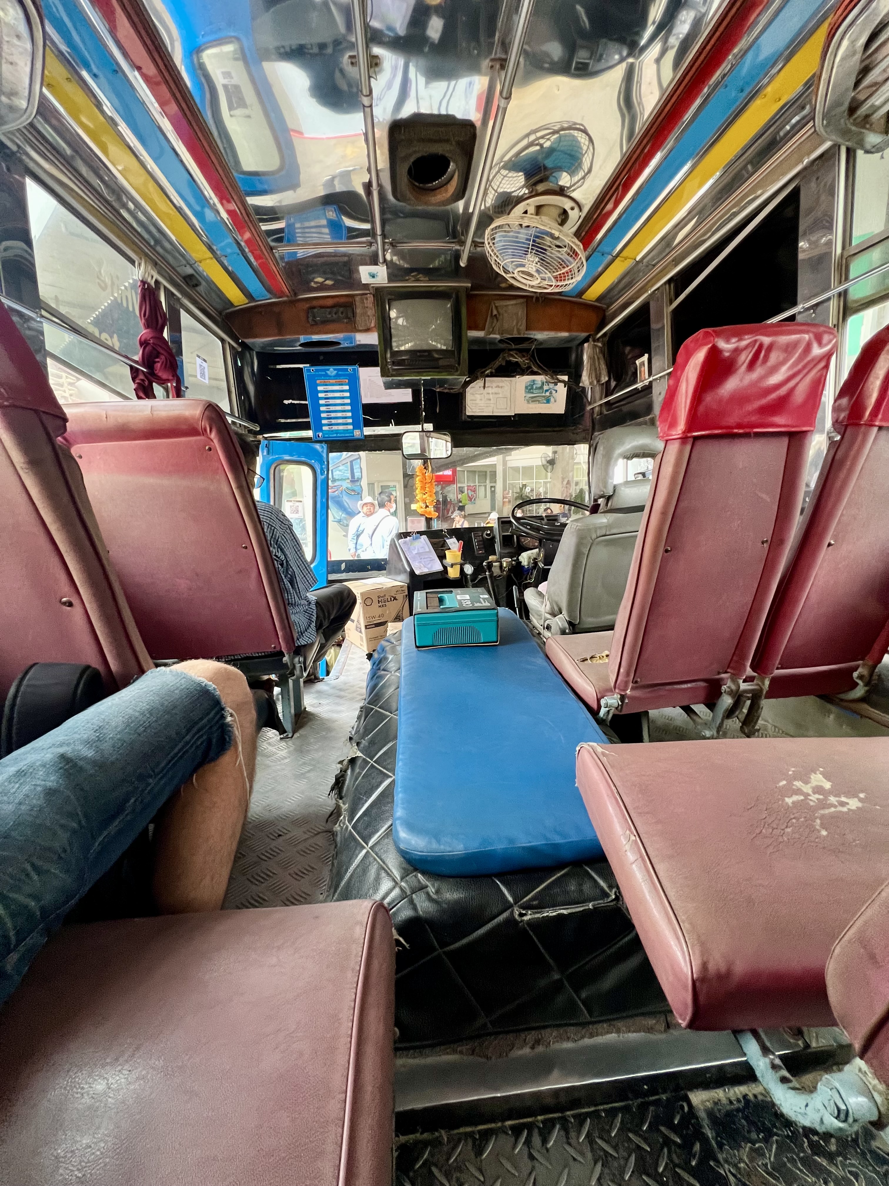 Il bus è vecchio, vissuto. I sedili sono sfibrati, un po’ impolverati. Le porte non si chiudono bene, a volte non si chiudono affatto. Dal soffitto pendono piccoli ventilatori che cercano di muovere l’aria. Niente aria condizionata. Solo strada.