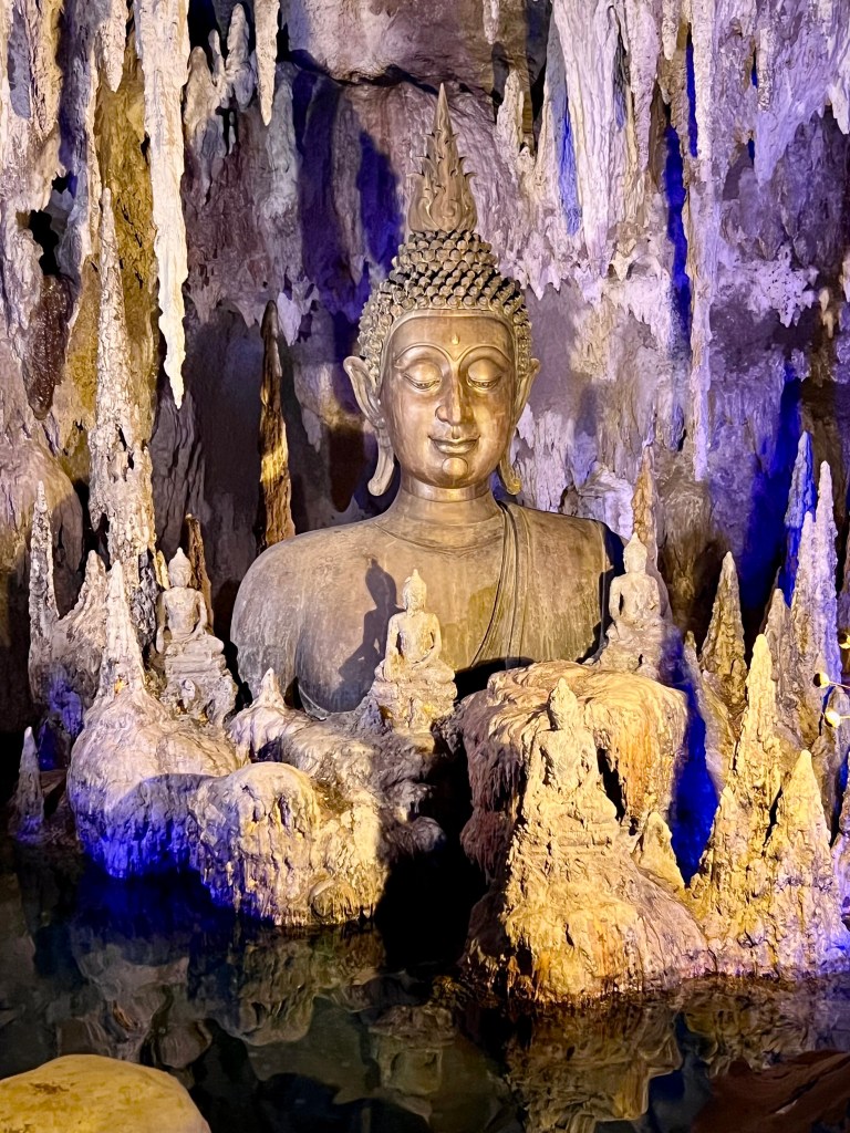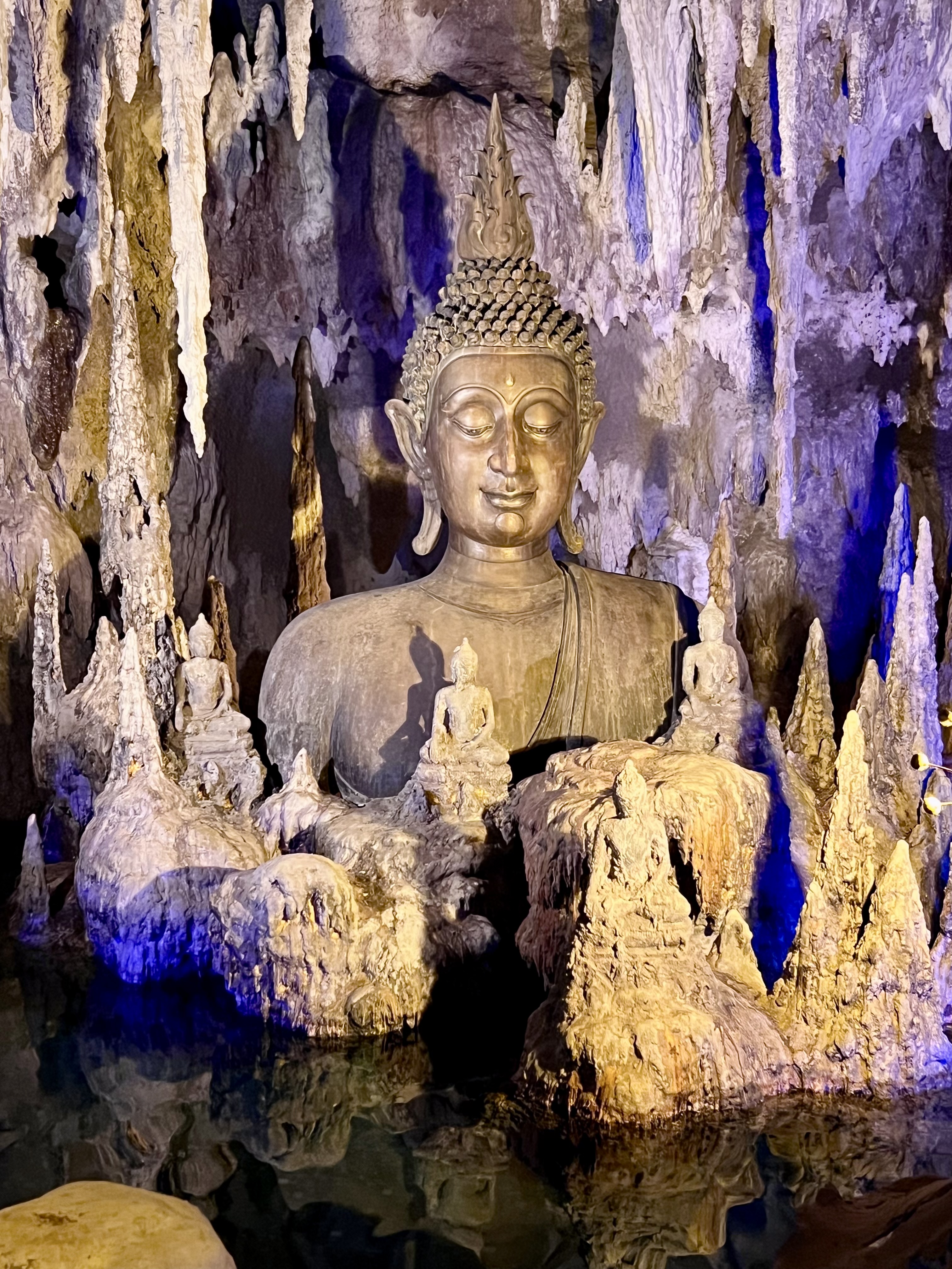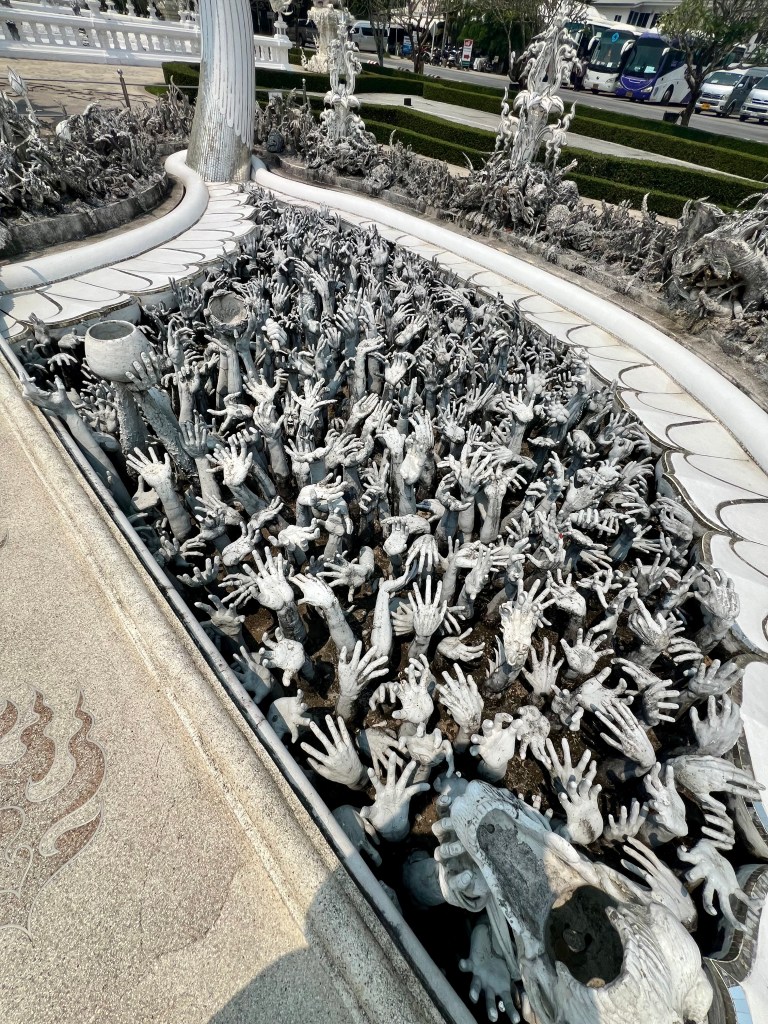 Continuo la visita. Nel complesso c’è anche un tempio dorato dedicato a Ganesha e una caverna artificiale decorata con mostri e mani protese verso i visitatori. Poi, lentamente, tutto si trasforma in bianco: stalattiti, stalagmiti, statue di Buddha. Rappresenta un viaggio simbolico dal “Regno della Sofferenza” (Inferno) al “Regno della Beatitudine” (Paradiso). Un viaggio simbolico dall’Inferno al Nirvana.