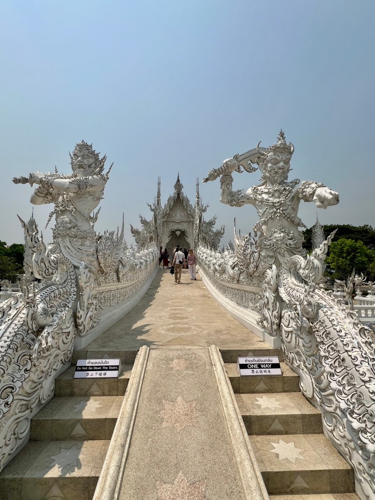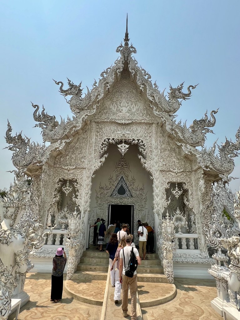 Il Wat Rong Khun è un tempio particolare, al tempo stesso buddista e induista, progettato da un artista thailandese. La sua costruzione è iniziata nel 1997 e, forse, terminerà nel 2070. È realizzato interamente in gesso bianco e specchietti che riflettono il sole creando giochi di luce quasi ipnotici. Una scelta criticata da alcune comunità locali, abituate a templi colorati e sgargianti.