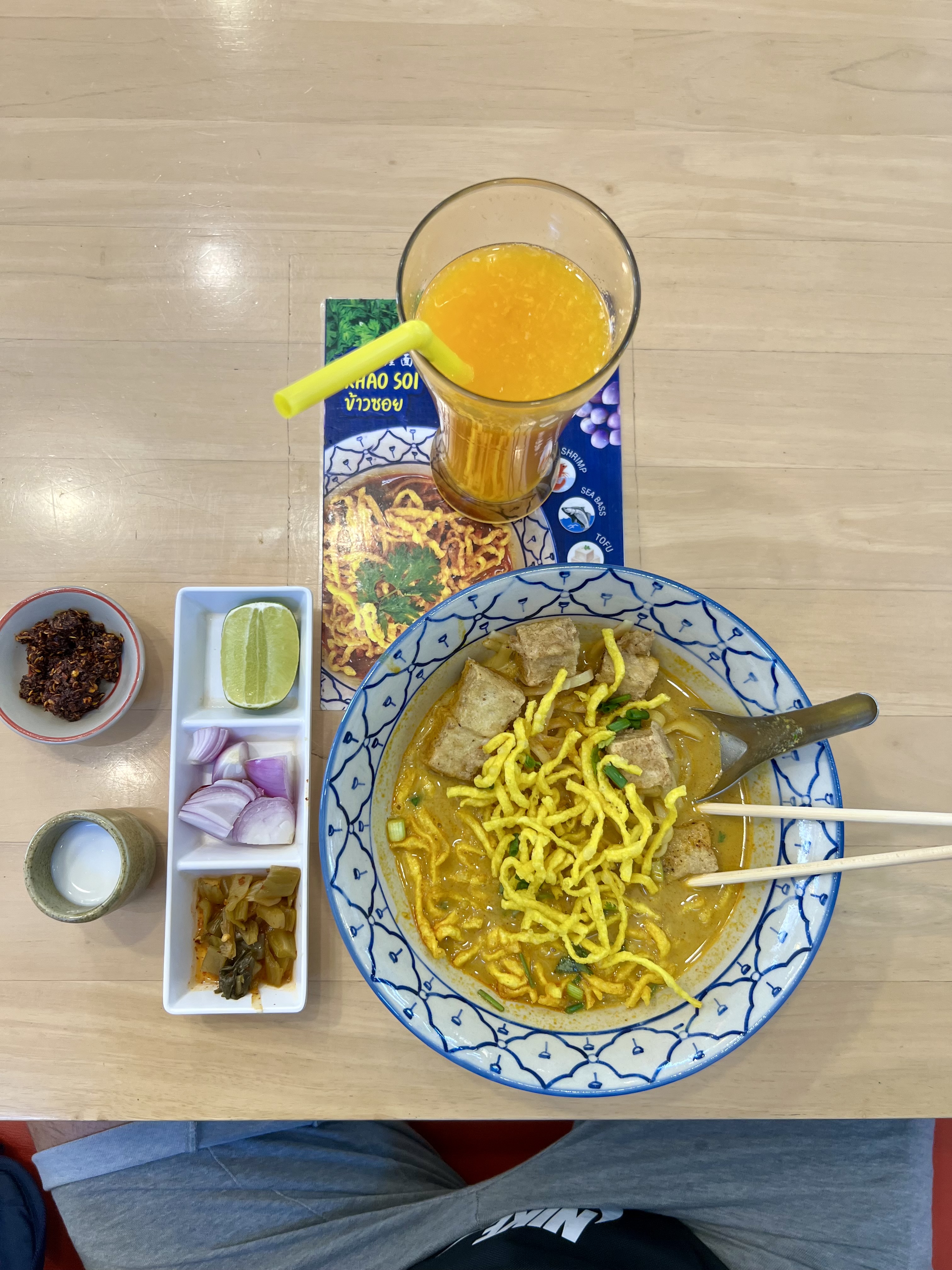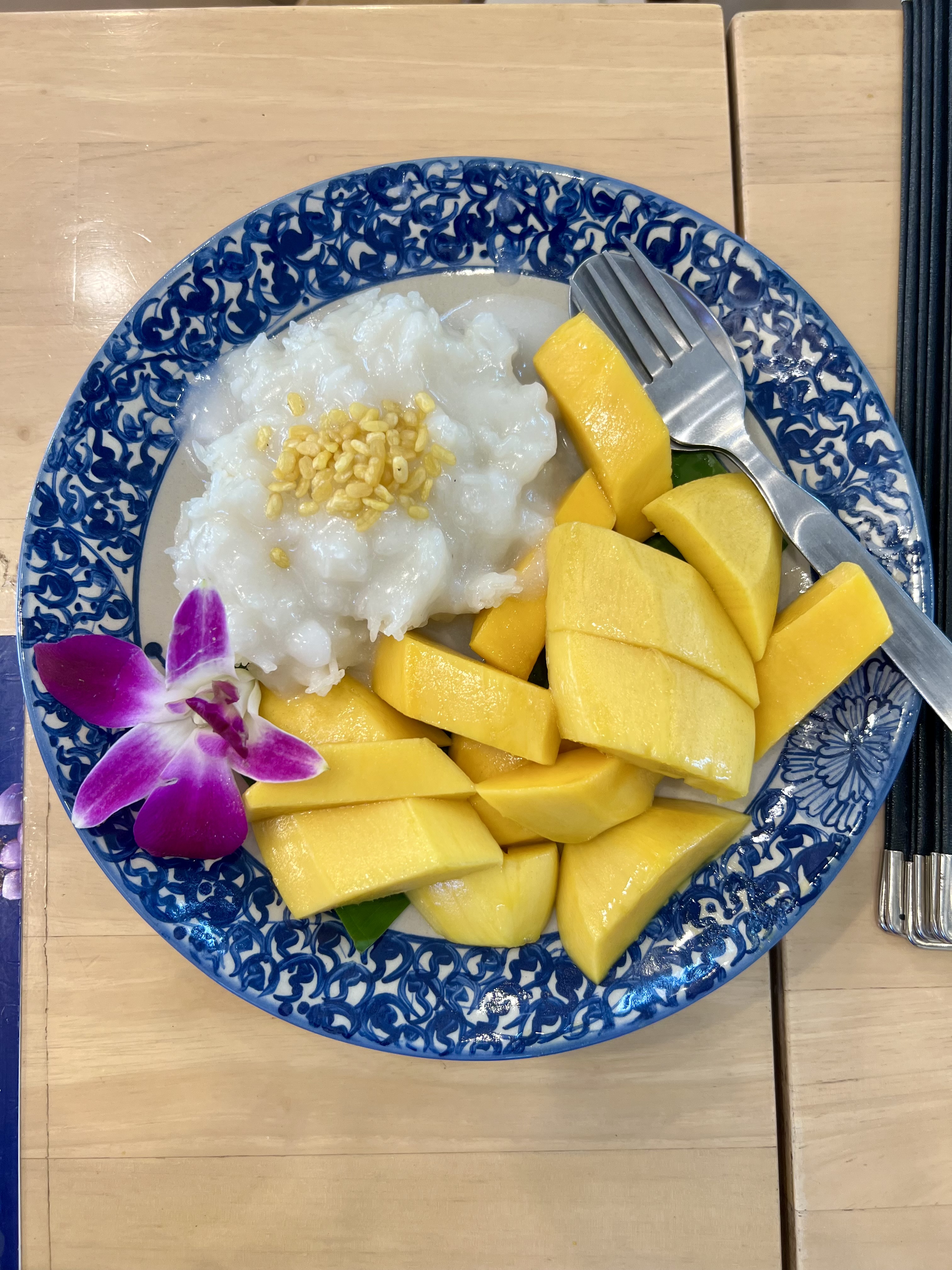 Attraverso la strada e mi fermo in un ristorante a pranzare. Khao Soi, un succo d’arancia e, per finire, un Mango Sticky Rice decorato con cura. Mangio lentamente, mi riposo, penso a cosa fare dopo.