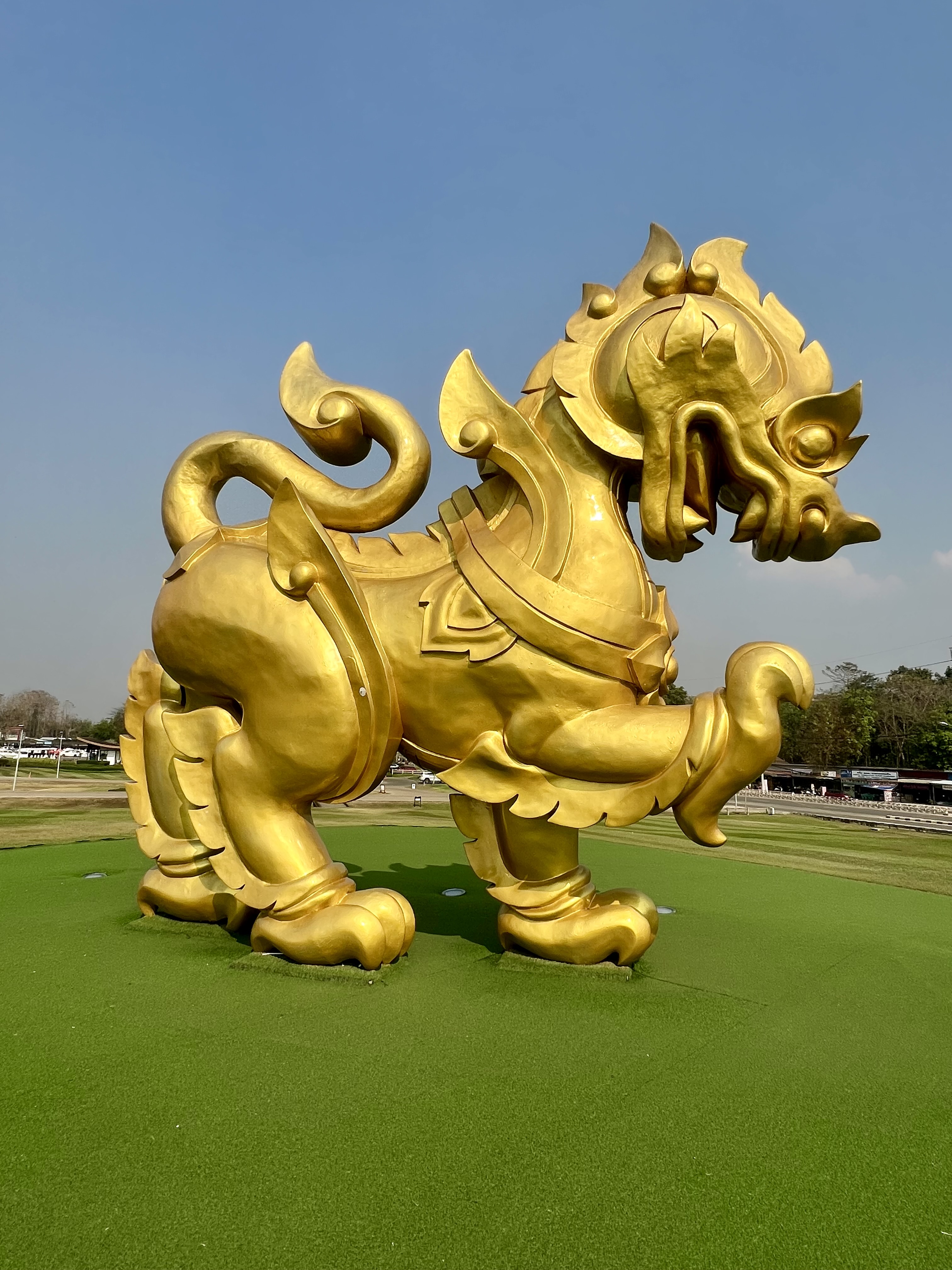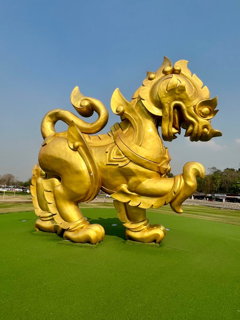Il parco si rivela subito immenso. Ci sono trenini che portano i visitatori in giro per quarantacinque minuti, fermandosi nei punti principali. A piedi, mi spiegano, servirebbero almeno quattro ore. Prima ancora di entrare, una gigantesca statua dorata del Singha accoglie i visitatori.