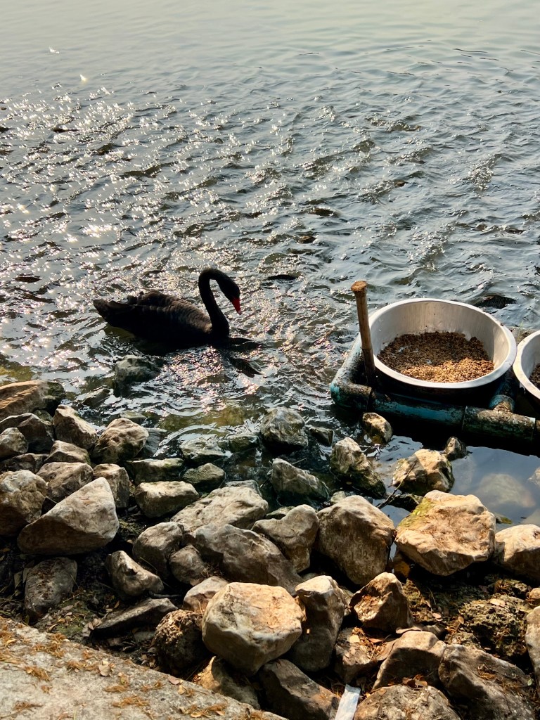 Scendiamo tutti. Il lago è silenzioso, con i cigni che scivolano sull’acqua. C’è un piccolo negozio che vende cibo per i pesci e qualche panchina all’ombra. Dopo una decina di minuti, l’autista ci richiama a bordo.