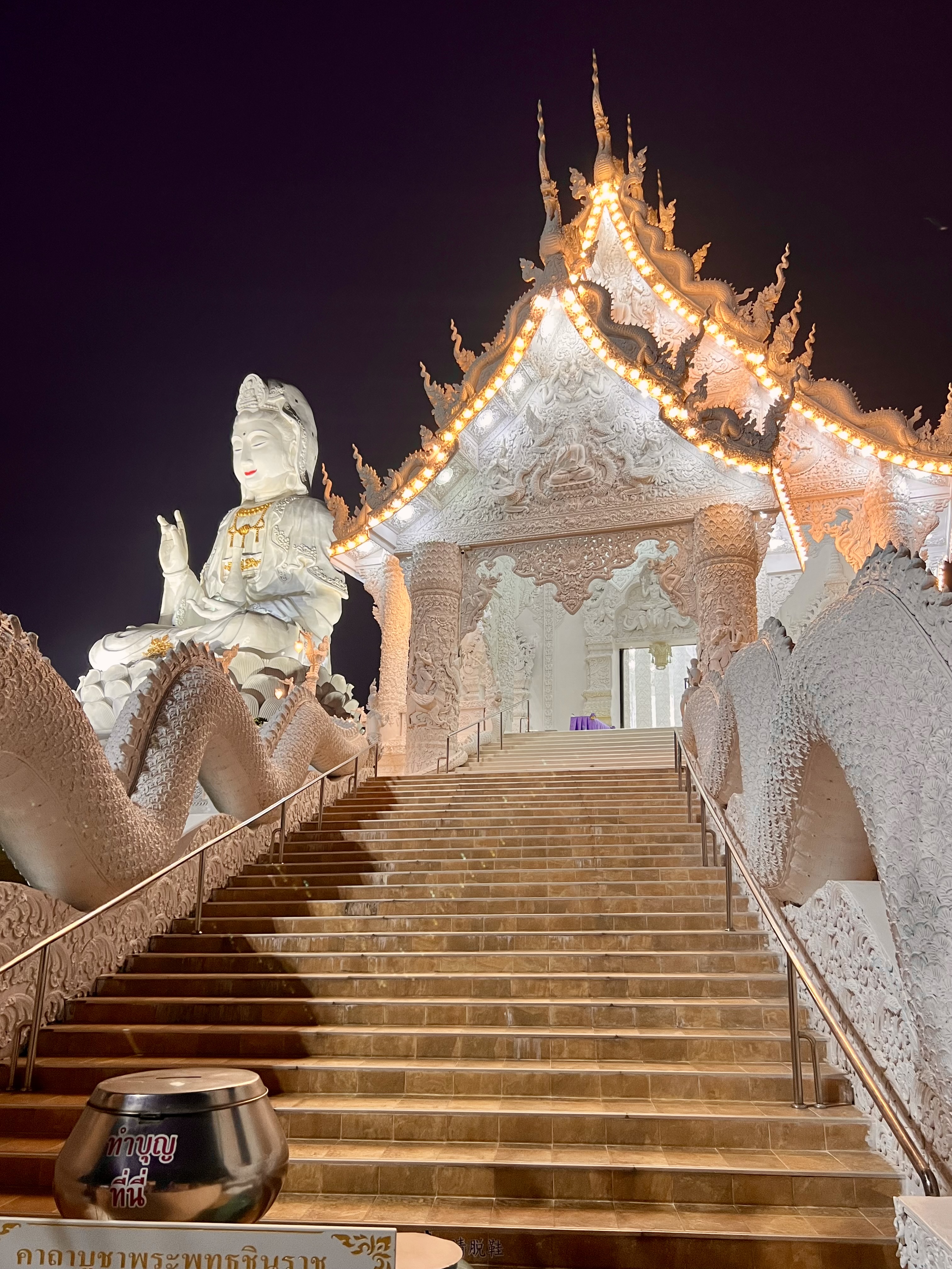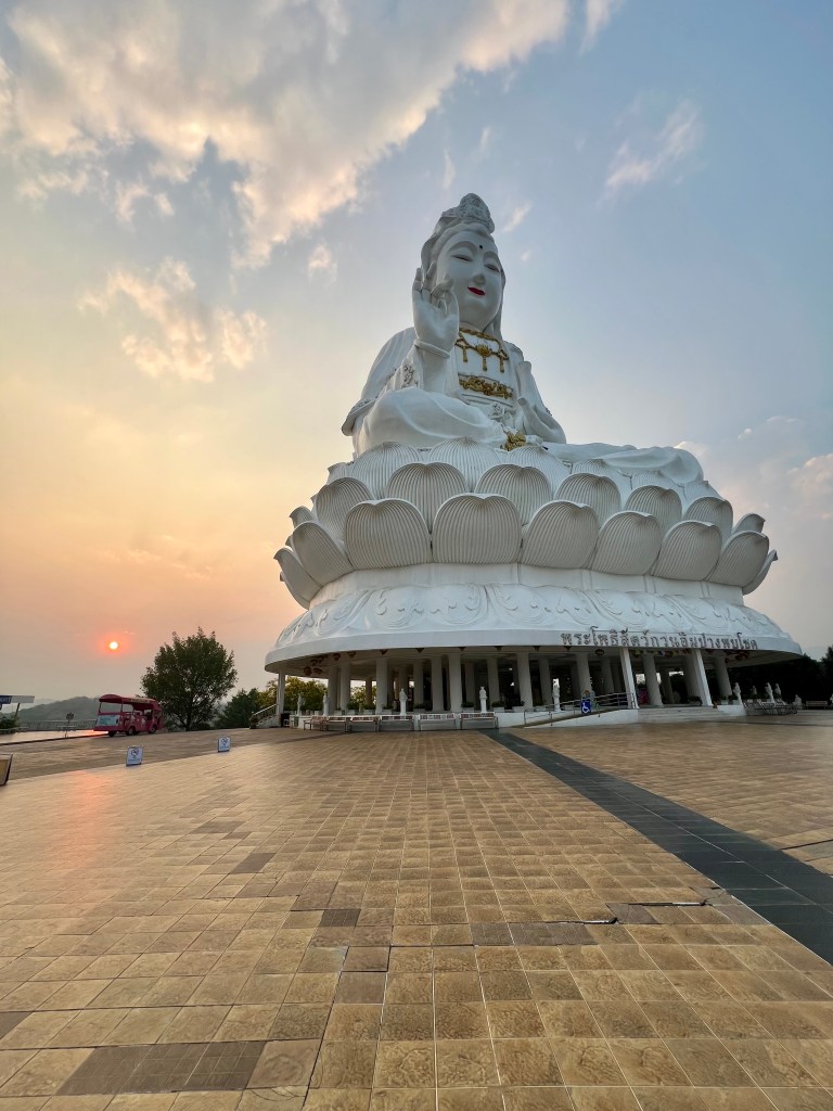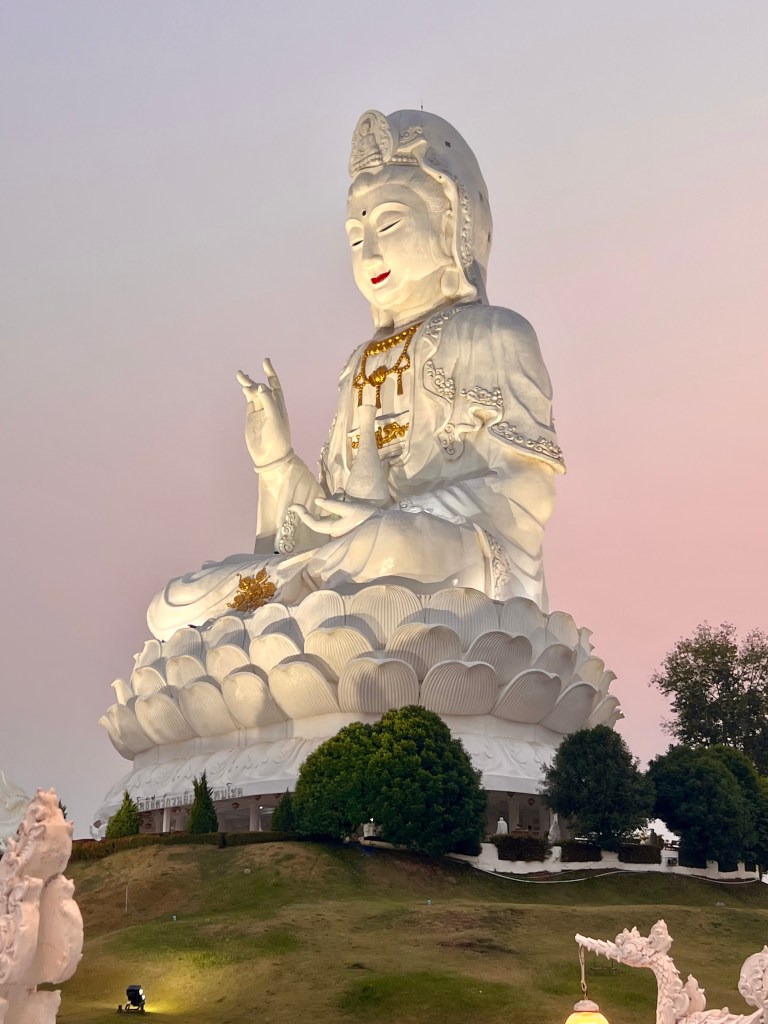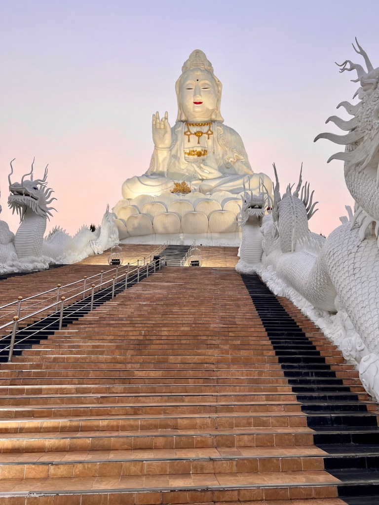 Esco dal parco e prenoto un Grab. Arriva poco dopo. In circa venti minuti siamo al Wat Huay Pla Kang. Scendo dall’auto: c’è poca gente e davanti a me si staglia la statua gigantesca di Guan Yin, bianca, imponente, alta circa 79 metri, che domina la collina. È stupenda.