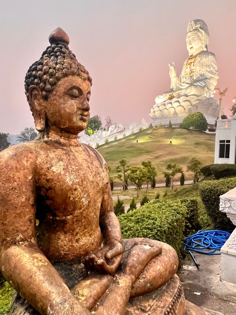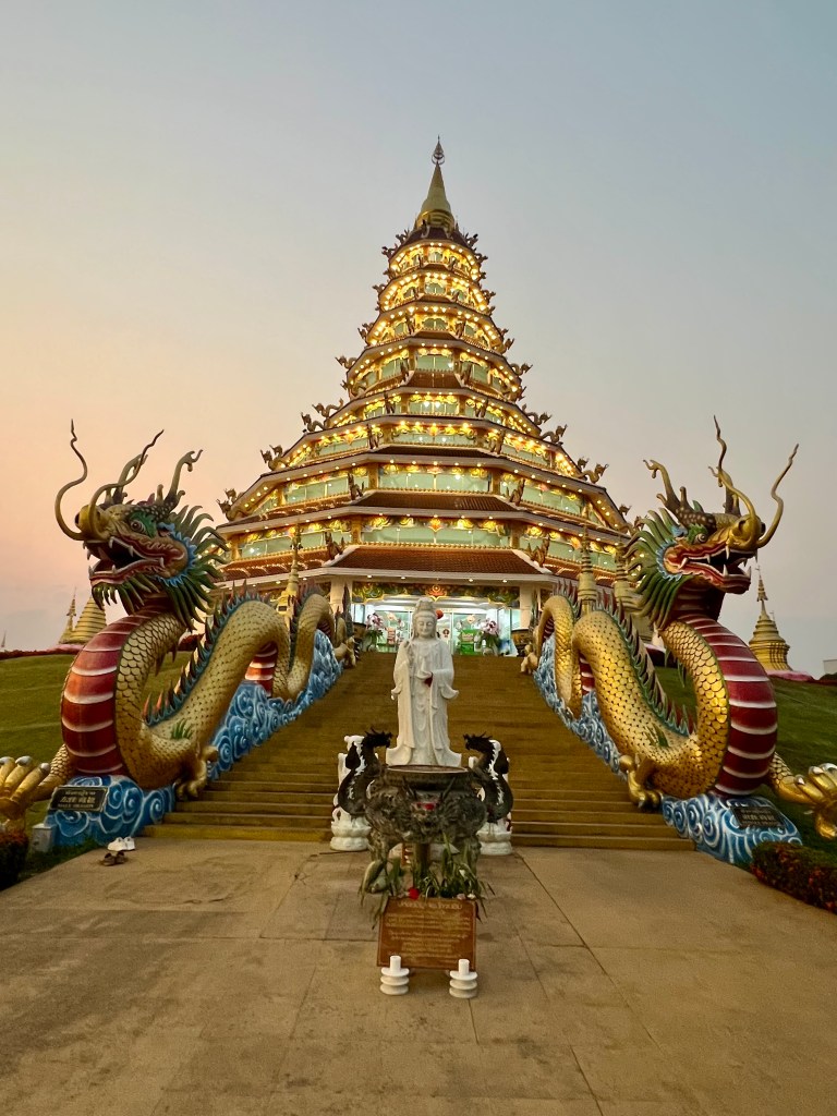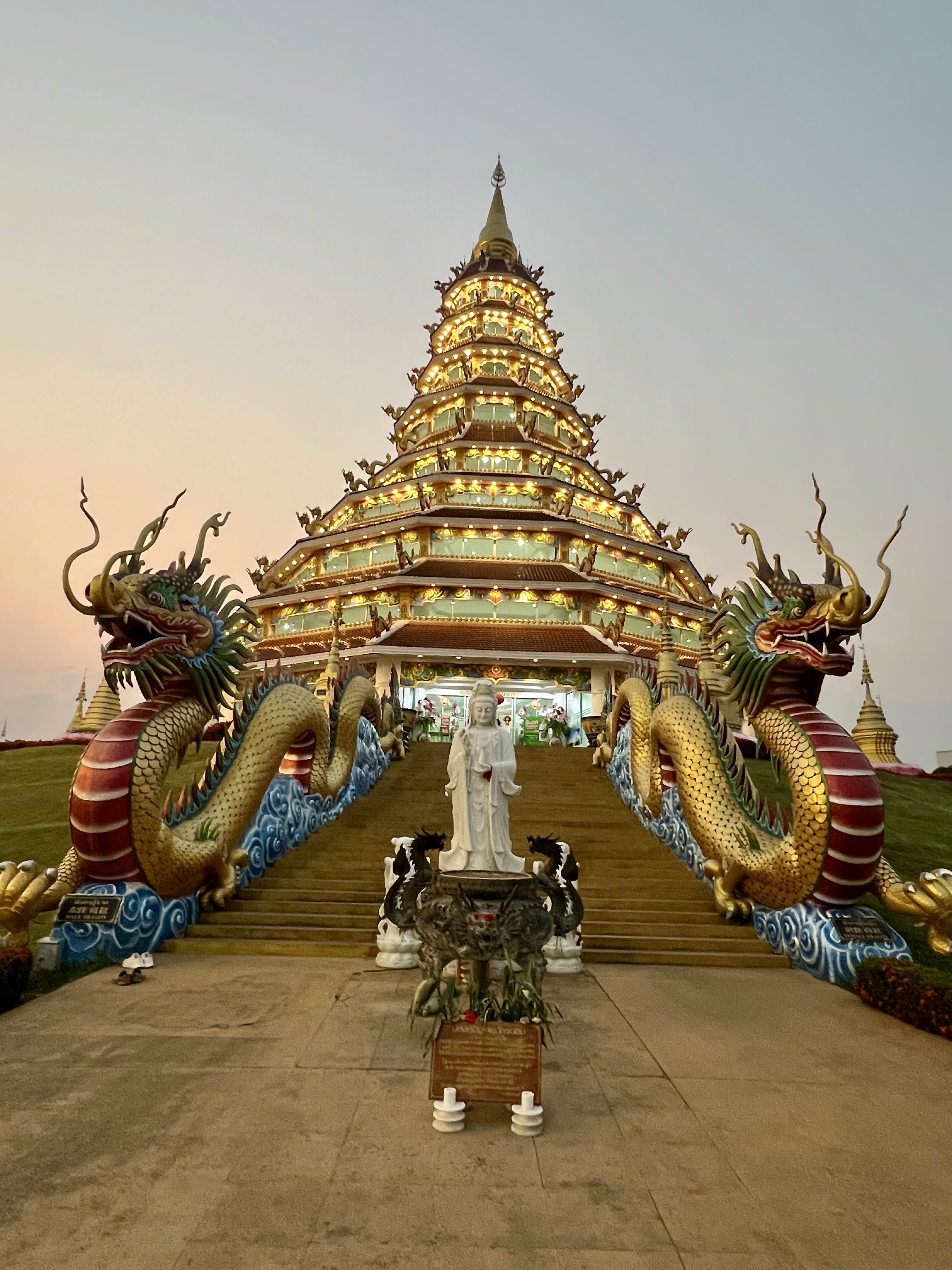 Esco dal parco e prenoto un Grab. Arriva poco dopo. In circa venti minuti siamo al Wat Huay Pla Kang. Scendo dall’auto: c’è poca gente e davanti a me si staglia la statua gigantesca di Guan Yin, bianca, imponente, alta circa 79 metri, che domina la collina. È stupenda.