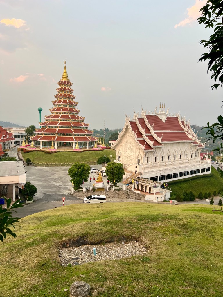 Dopo la visita, mi sposto verso la pagoda a nove piani, la Phop Chok Dhamma Chedi, con il suo tetto rosso e i grandi draghi cinesi che sorvegliano la scalinata. È una struttura che mescola elementi thailandesi, cinesi ed europei. Ogni piano rappresenta uno stadio di elevazione spirituale; il numero nove, qui, è simbolo di fortuna. Salgo lentamente, piano dopo piano, tra statue finemente intagliate in legno di sandalo profumato, fino all’ultimo livello, da cui si apre una vista a 360 gradi sulle colline di Chiang Rai e sulla statua gigante.