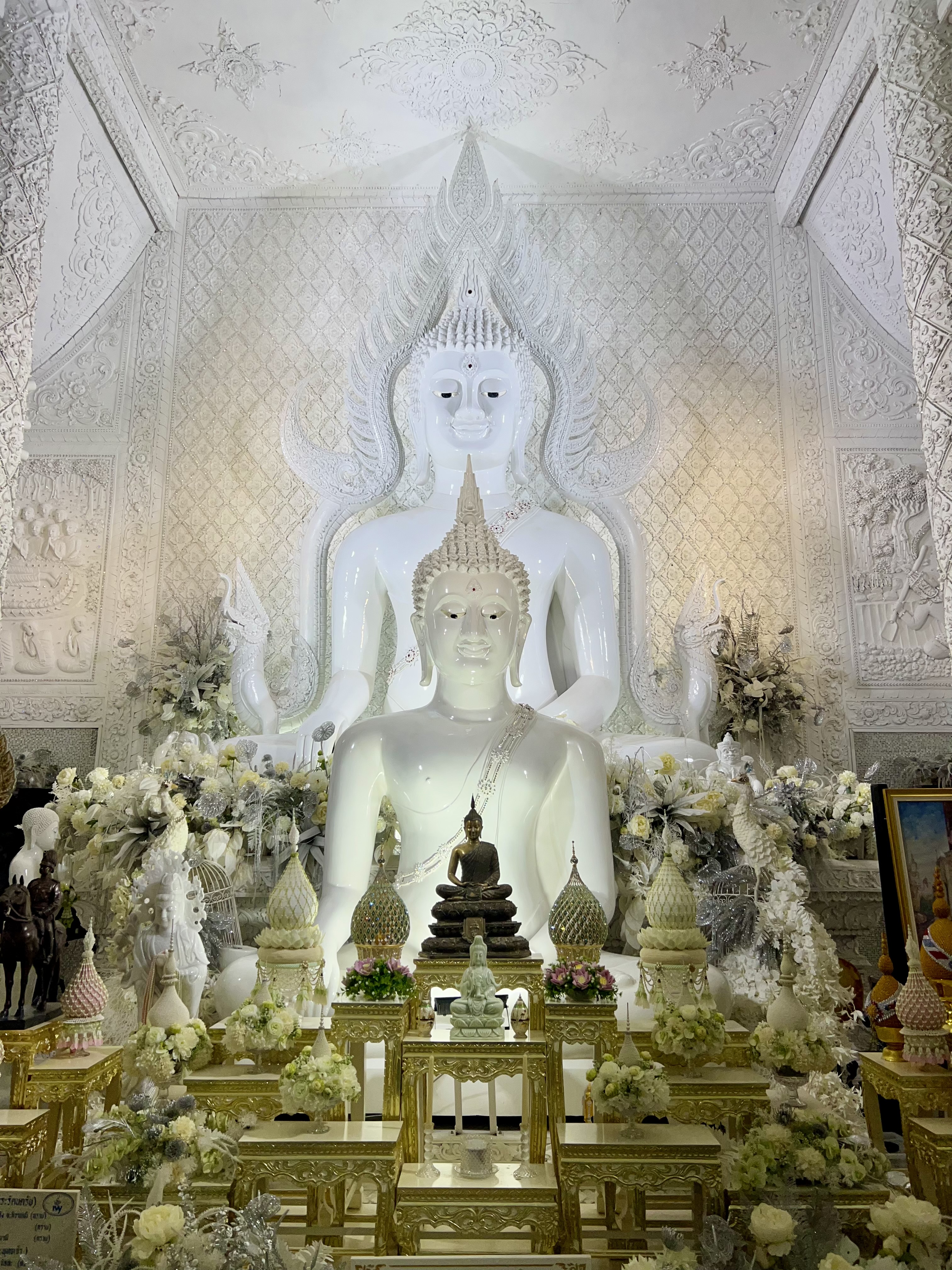 Quando il sole si nasconde del tutto dietro le colline, vado a visitare il tempio bianco in stile Lanna, poco distante. È interamente decorato con stucchi bianchi. All’interno, una statua candida del Buddha. Non c’è nessuno, solo silenzio e pace.