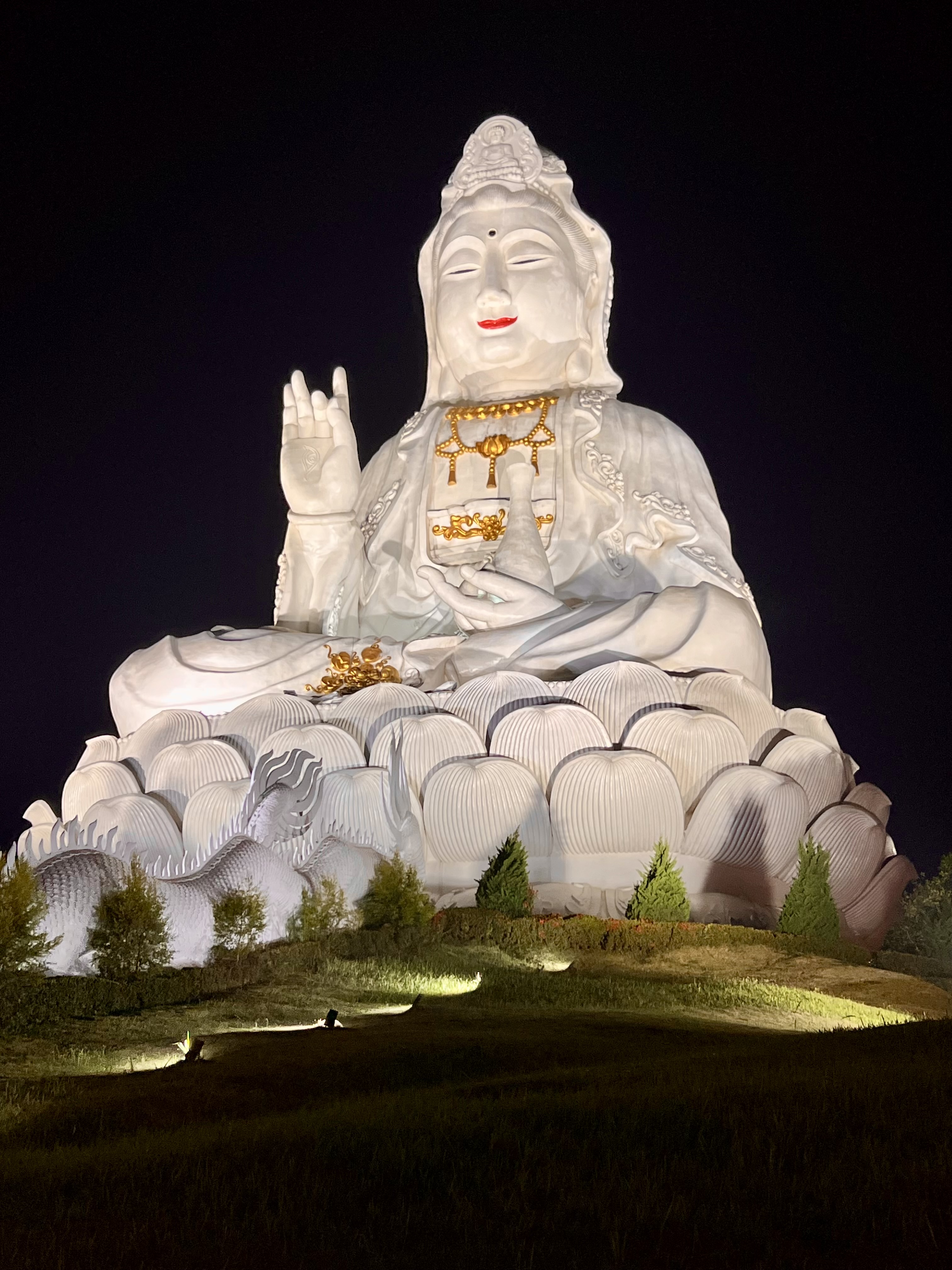 Dopo circa quaranta minuti esco. Il piazzale è vuoto. Sono rimasto completamente solo. È calato il buio. Scatto qualche foto ai monumenti illuminati, la statua di Guan Yin è ancora più suggestiva di notte. Mi siedo su una panchina, accendo una sigaretta e mi godo quel silenzio pieno.